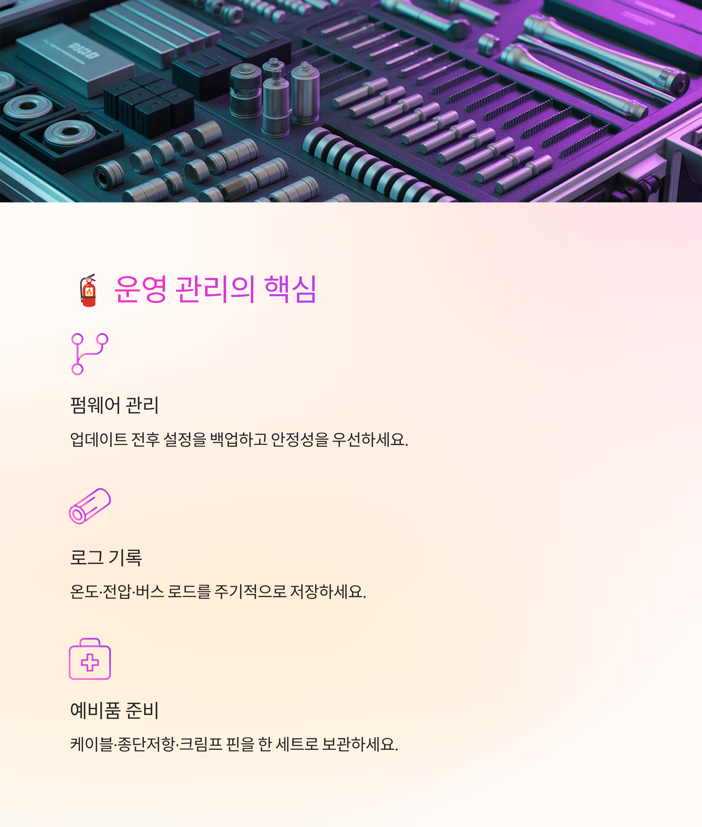 예비품은 케이블과 종단저항, 크림프 핀까지 한 세트로 보관해요. 현장에 이 세트만 있으면 대부분의 장애는 30분 안에 가닥이 잡혀요.