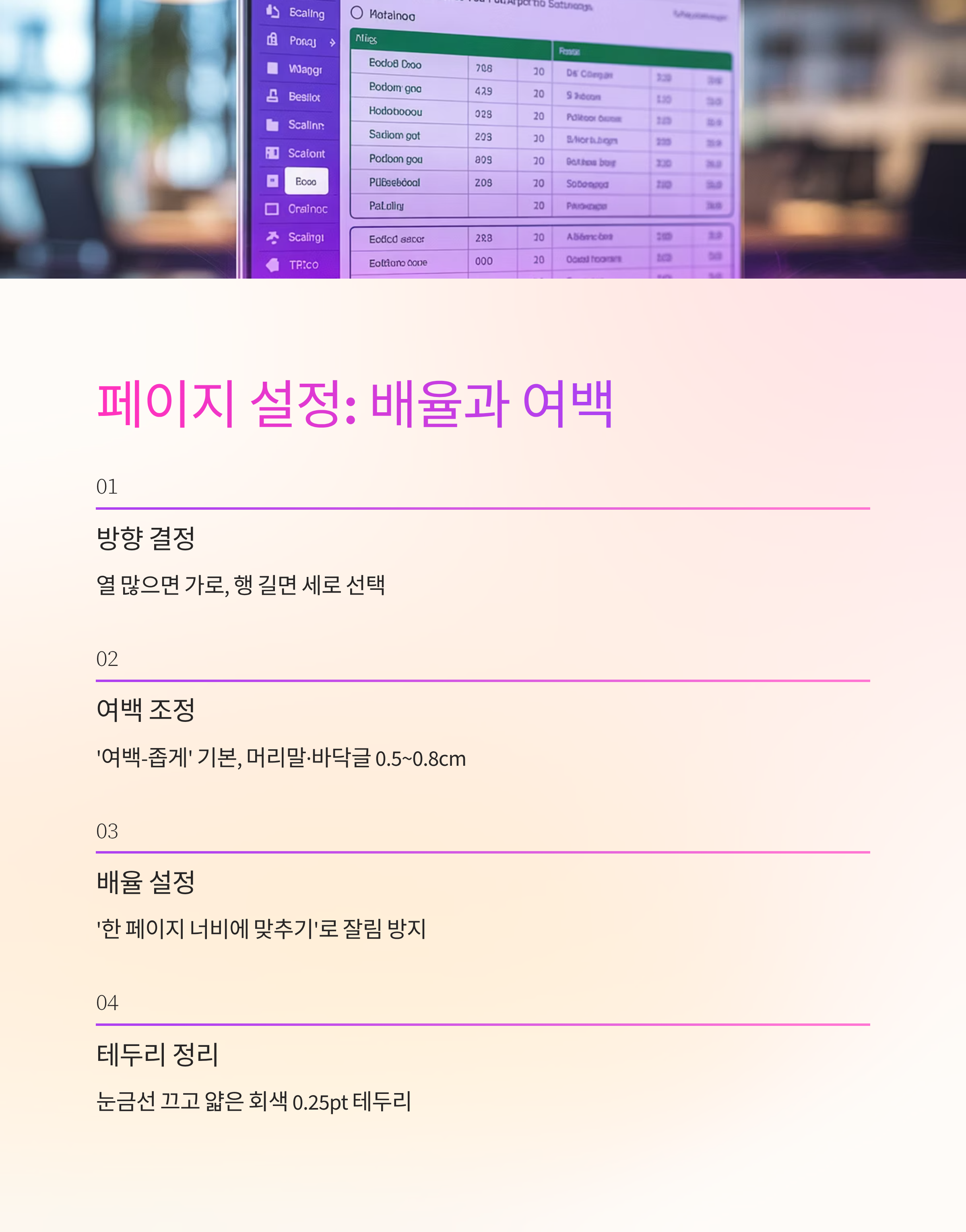 레이아웃에서 방향(가로/세로)부터 결정해요. 열이 많으면 가로로 돌려 한 페이지에 담고, 행이 길면 세로로 두어 스크롤 흐름을 살려요. 그다음 ‘여백-좁게’를 기본으로 두고, 머리말·바닥글 여백만 0.5~0.8cm 남겨 프린터 허용 한계를 피해요.