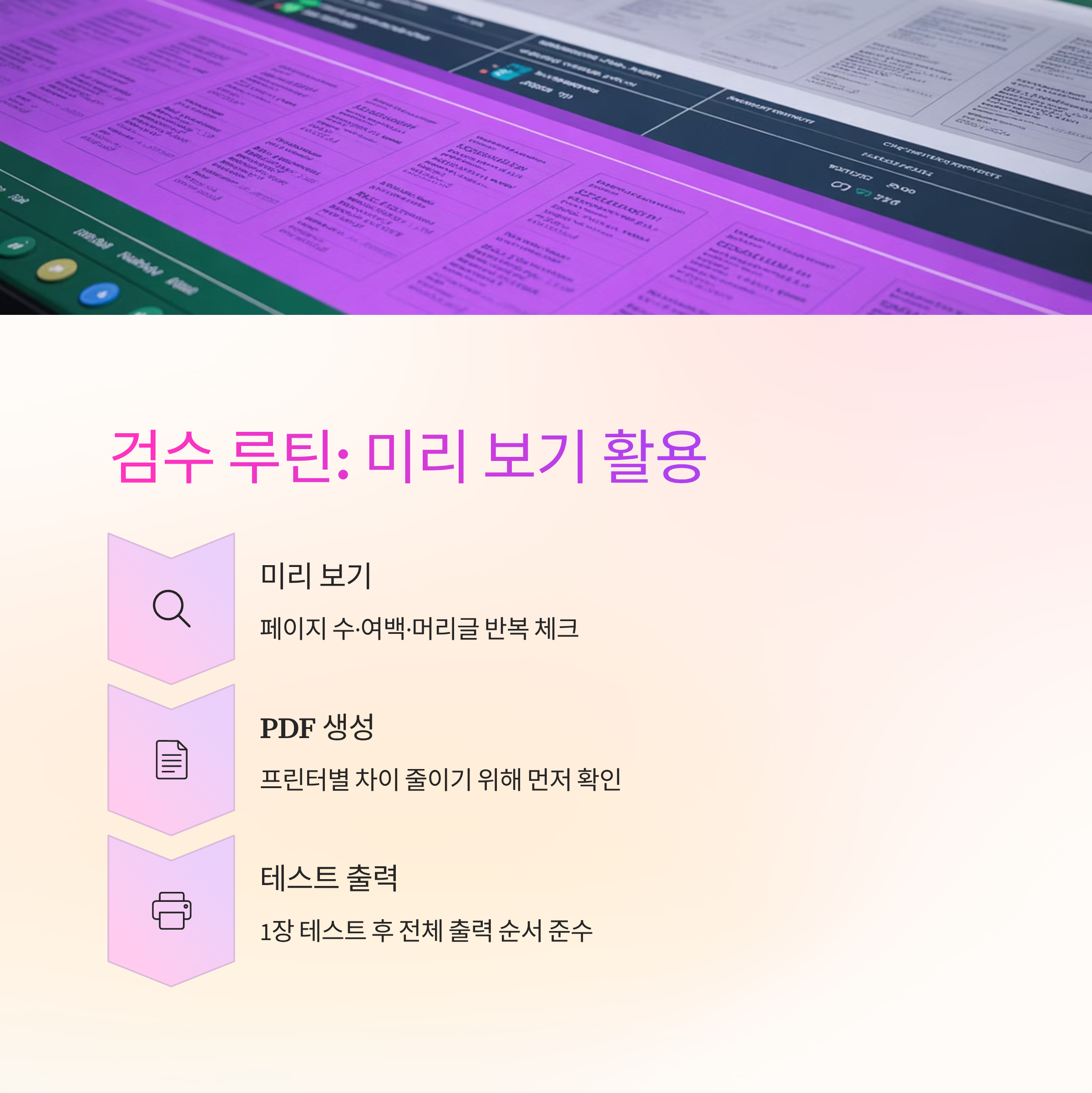 인쇄 미리 보기에서 페이지 수·여백 균형·머리글 반복만 체크해도 대부분의 실수가 잡혀요. 확대 100%로 숫자 가독성을 보고, 표가 너무 조밀하면 배율을 5% 단위로만 조정해요.