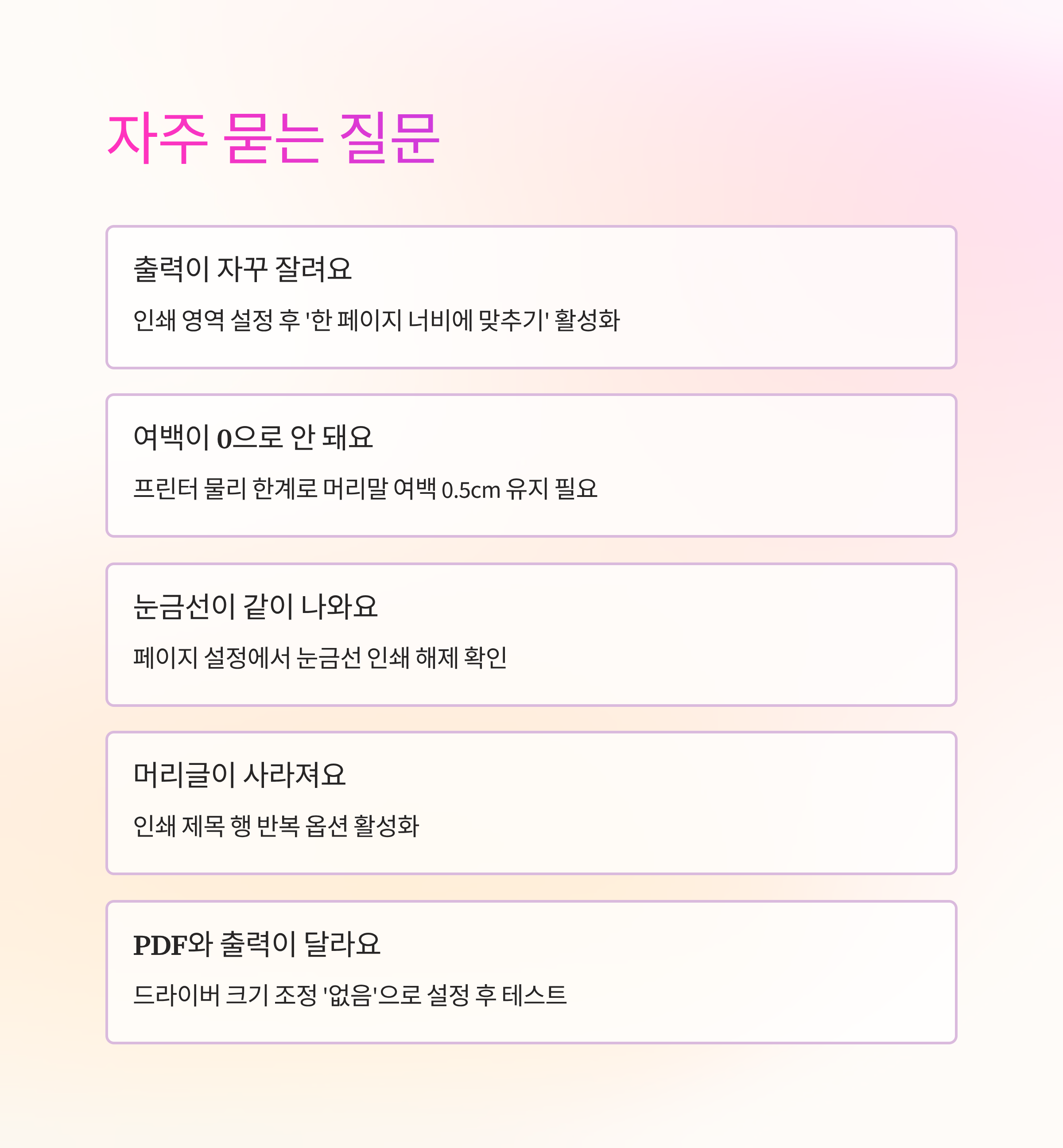 실제 프린터는 ‘여백 최소’ 같은 장치 옵션이 따로 있어요. 모델마다 다르니 첫 출력에서 한 장만 테스트해 최적값을 적어 두세요. 이후엔 그 프리셋만 불러오면 돼요. 이런 습관 하나로 엑셀여백없이인쇄 성공률이 확 올라가요.