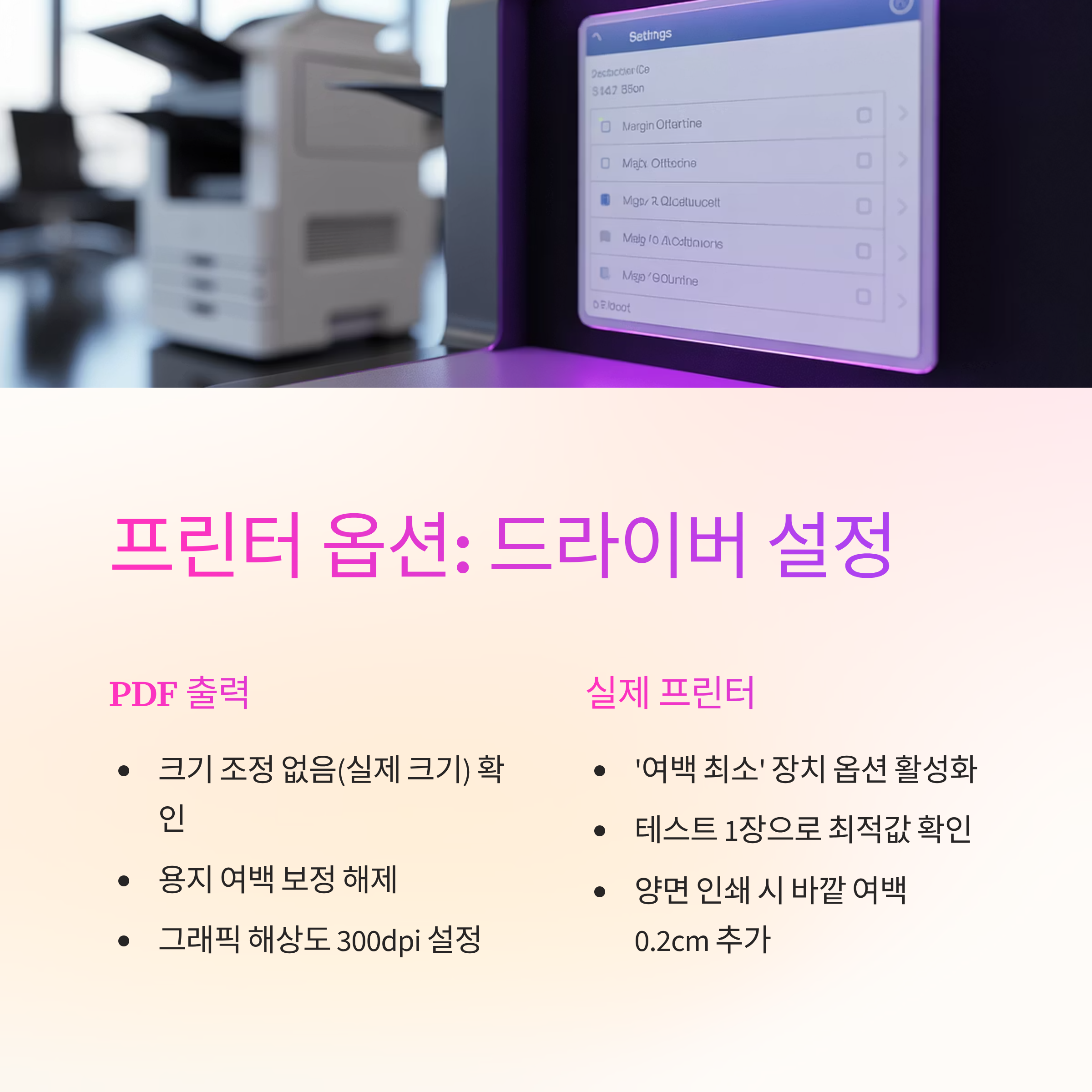 PDF로 뽑을 땐 ‘크기 조정 없음(실제 크기)’ 옵션을 확인해요. 프린터가 임의로 축소/확대를 걸면 설정이 무력화되거든요. 용지 여백 보정이 켜져 있으면 끄고, 고급에서 그래픽 해상도는 300dpi 전후가 균형이에요.