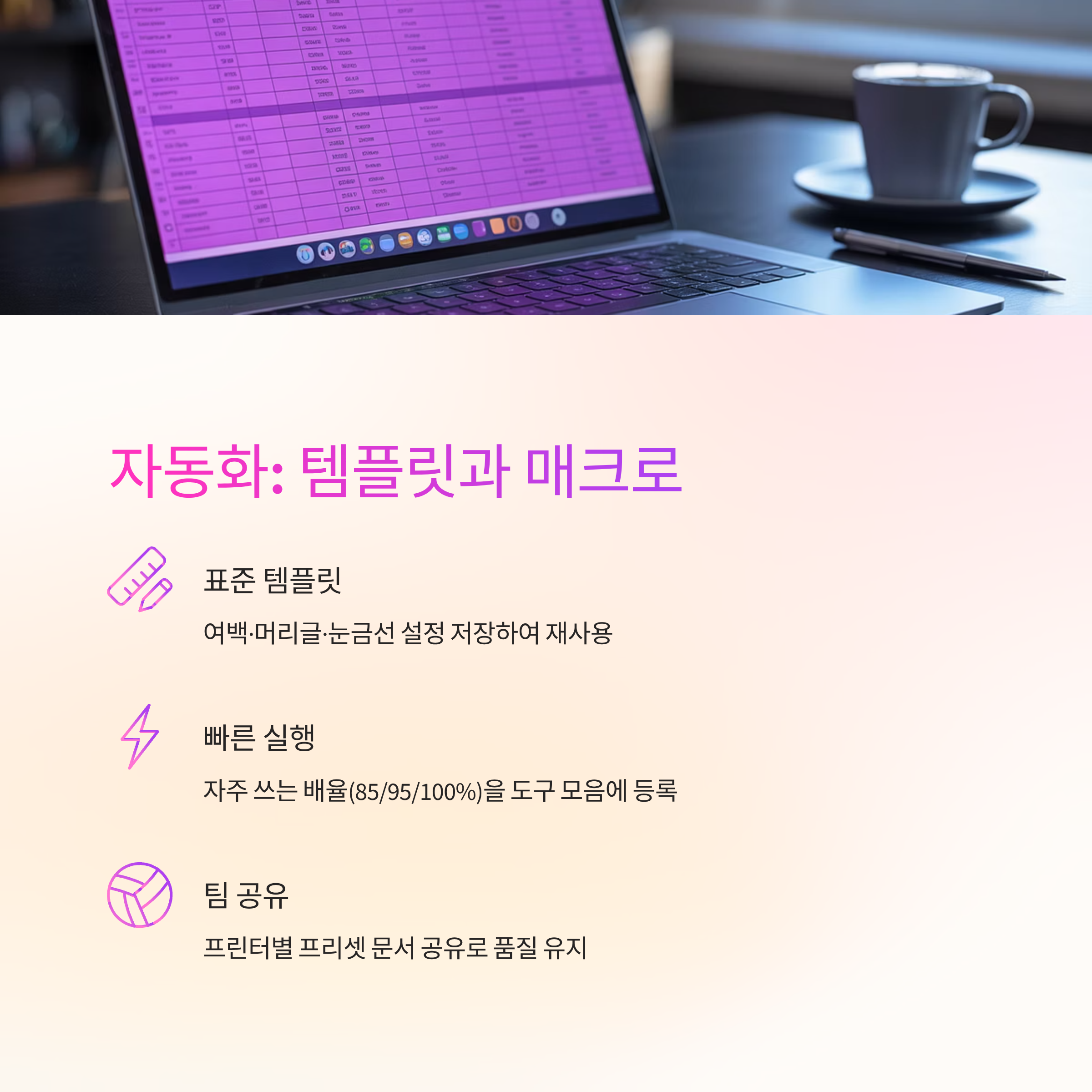 표준 인쇄 템플릿을 만들어 ‘여백 좁게·머리글 반복·눈금선 끄기’를 저장해 두면 새 파일에서도 바로 적용돼요. 파일 열 때 자동으로 영역을 잡아 주는 작은 매크로를 얹어도 좋아요.