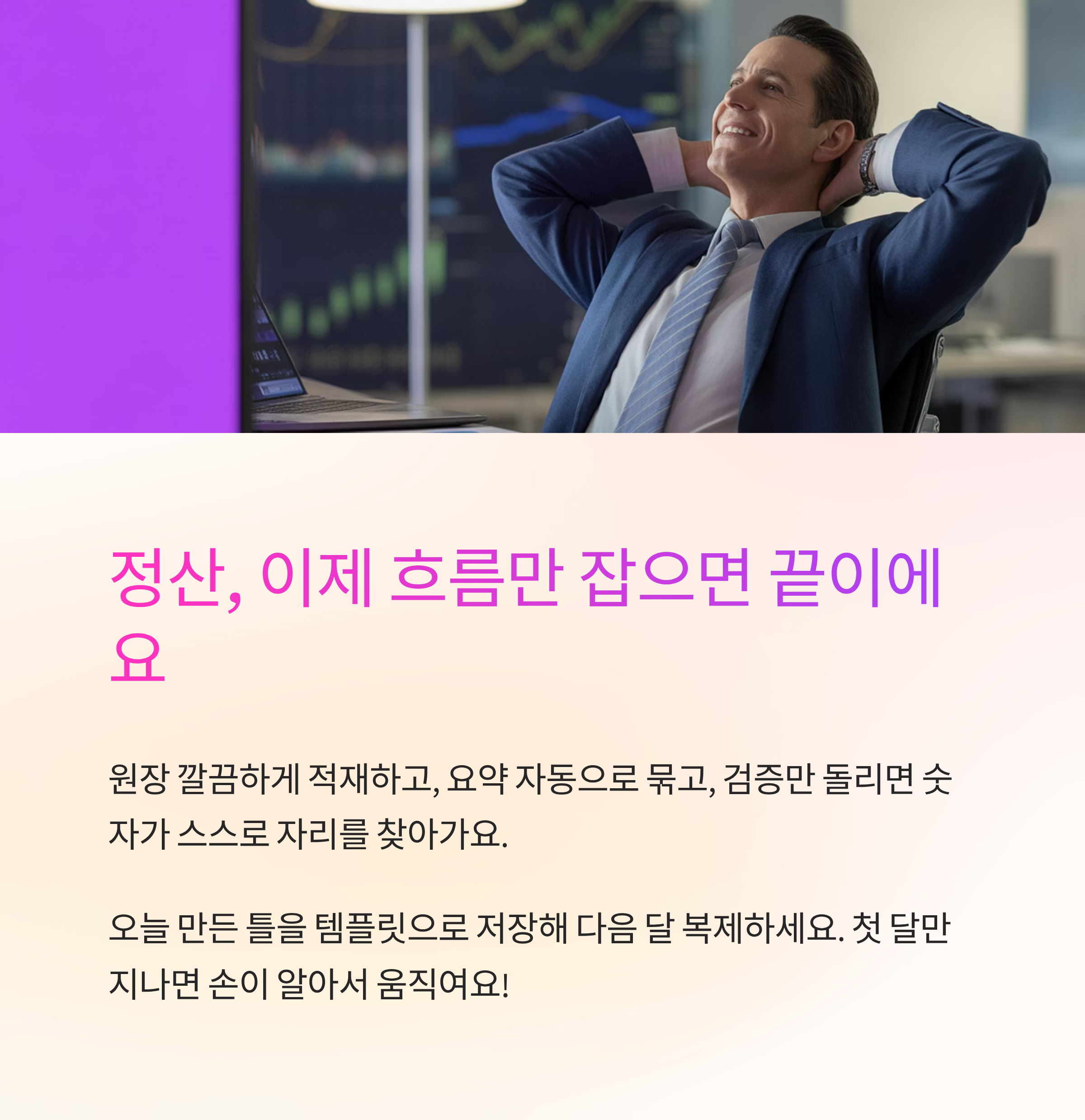 정산은 복잡해서 힘든 게 아니라, 흐름이 없어서 버거운 경우가 많더라고요. 원장을 깔끔하게 적재하고, 요약은 자동으로 묶고, 마지막에 검증만 돌리면 숫자가 스스로 자리를 찾아가요. 오늘 만든 틀을 템플릿으로 저장해 두고 다음 달에 그대로 복제해 보세요. 첫 달만 지나면 손이 알아서 움직이고, 보고 품질도 꾸준히 일정해질 거예요.