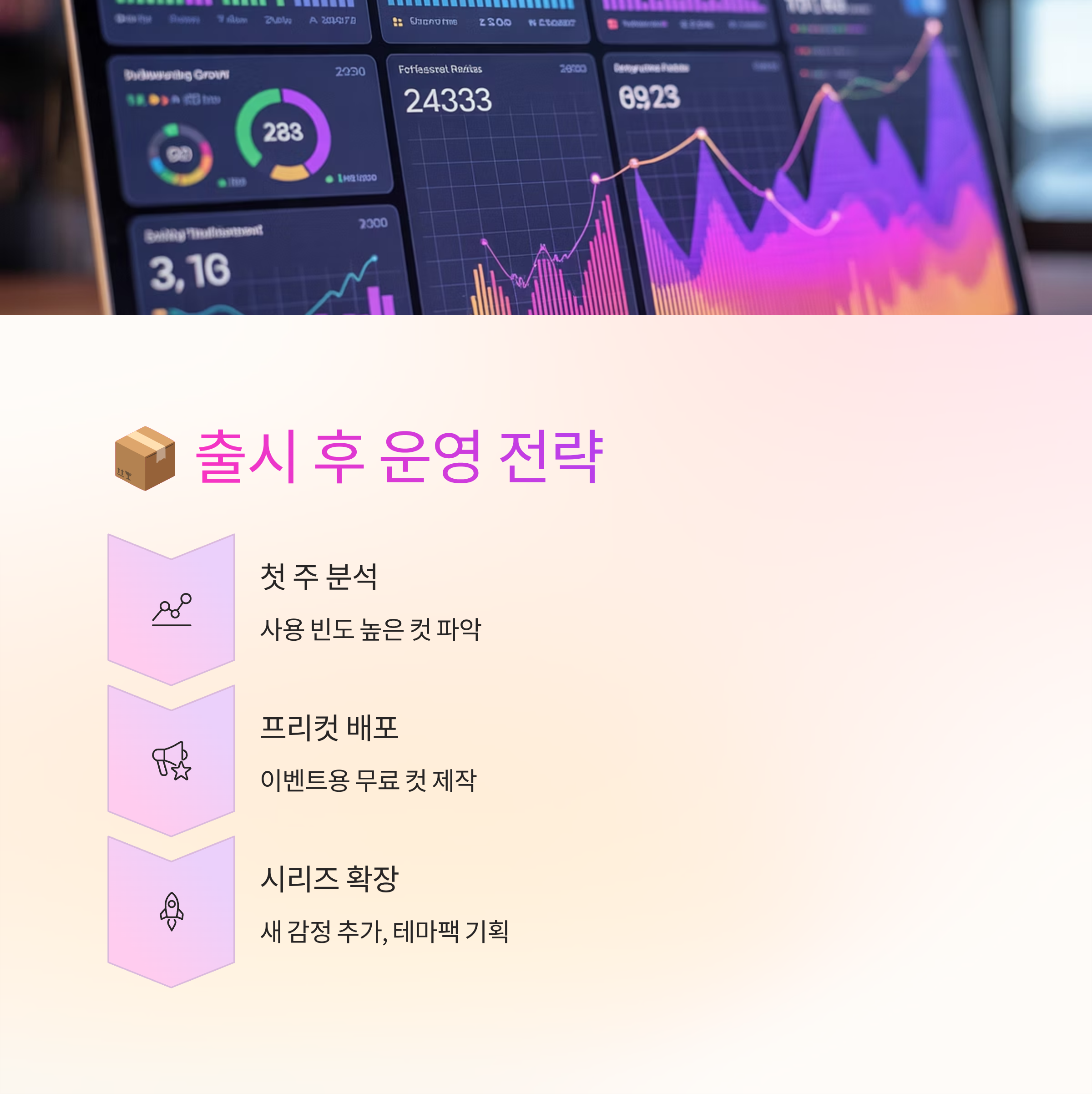 런칭 직후 첫 주는 피드백의 황금 구간이에요. 사용 빈도가 높은 컷과 외면받는 컷을 빠르게 구분해 기록해두세요. 리뷰에서 반복되는 키워드를 모아 다음 업데이트 방향을 잡으면 좋아요. 이벤트용 프리컷을 만들어 배포하면 확산에 도움이 돼요.
