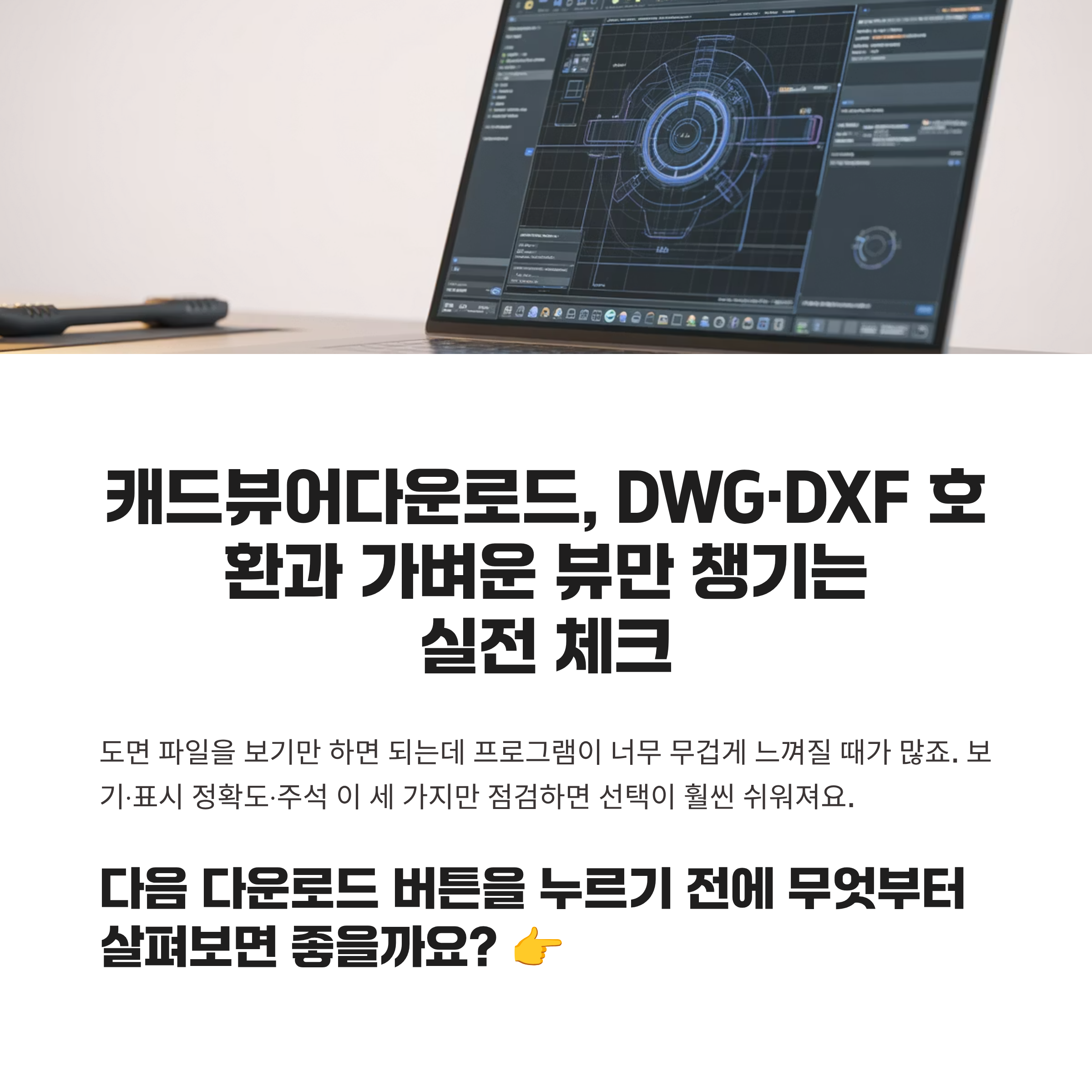도면 파일을 보기만 하면 되는데 프로그램이 너무 무겁게 느껴질 때가 많죠. 설치하자니 용량이 부담되고, 온라인 뷰어는 기능이 아쉽고, 회사 보안 정책도 신경 쓰여서 결정이 망설여지실 거예요. 사실 보기·표시 정확도·주석 이 세 가지만 점검하면 선택이 훨씬 쉬워져요. 오늘은 복잡한 비교표 대신, 바로 적용할 수 있는 기준과 설치 전 확인 포인트를 깔끔하게 정리해드릴게요. 다음 다운로드 버튼을 누르기 전에 무엇부터 살펴보면 좋을까요?