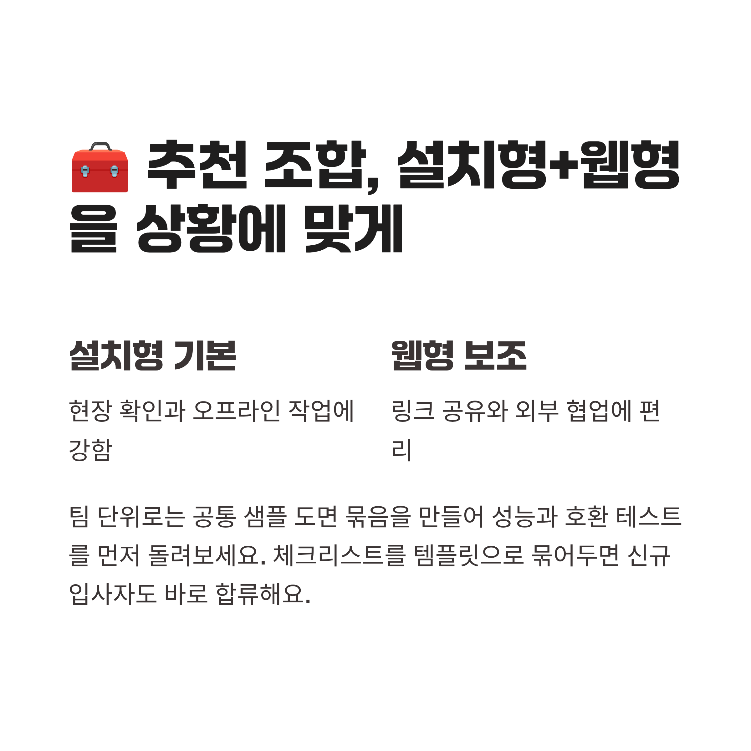 A. 오프라인이 잦으면 설치형, 공유가 많으면 웹형이 편해요. 필요하면 두 가지를 함께 쓰는 조합이 좋아요.
