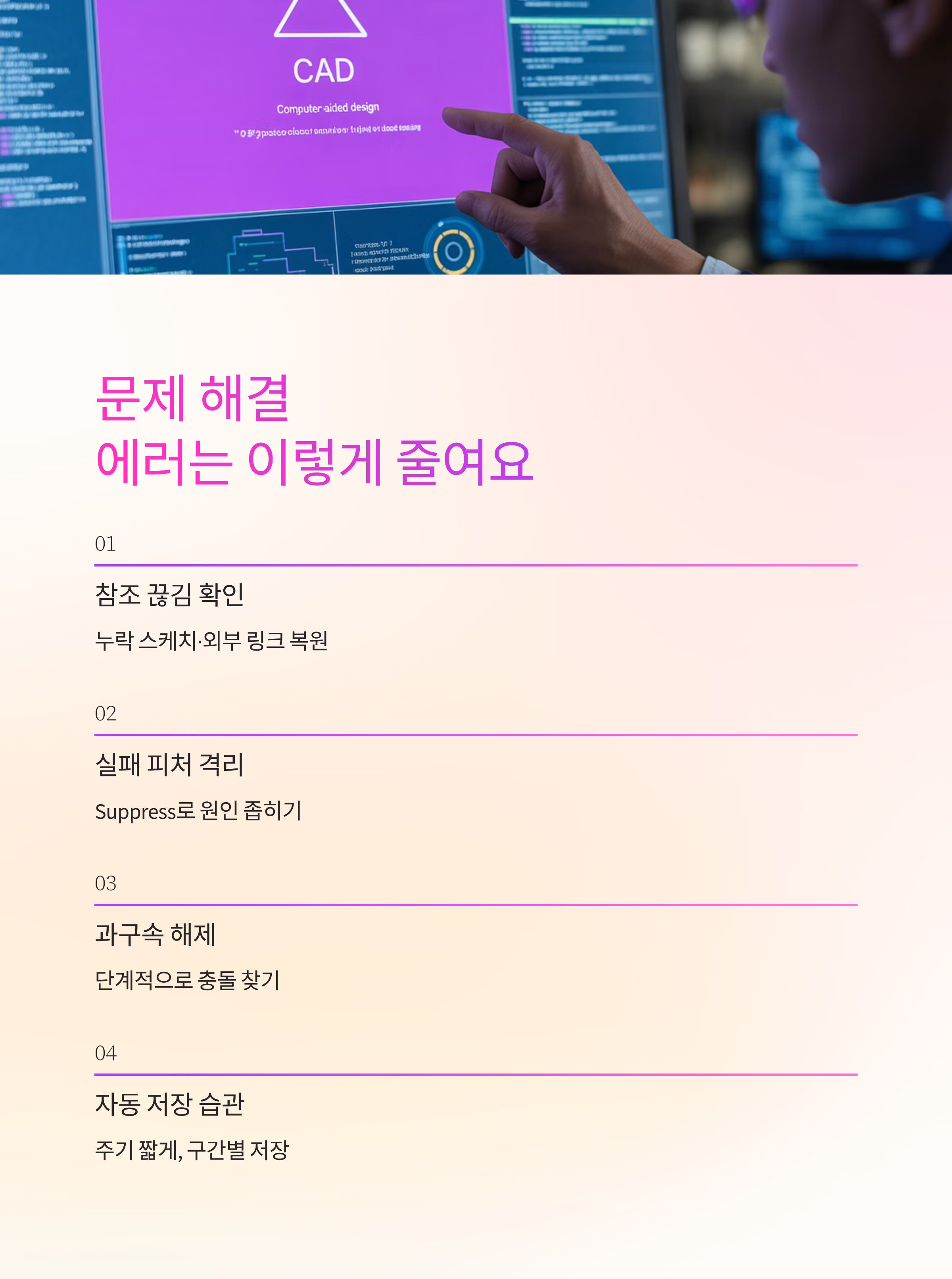 오류가 나면 먼저 참조 끊김부터 의심해요. 누락된 스케치나 외부 링크를 복원하고, 실패 피처는 suppress로 잠시 꺼서 원인을 좁혀요. 스케치가 과구속이면 구속을 단계적으로 풀어 충돌을 찾는 게 빨라요.
