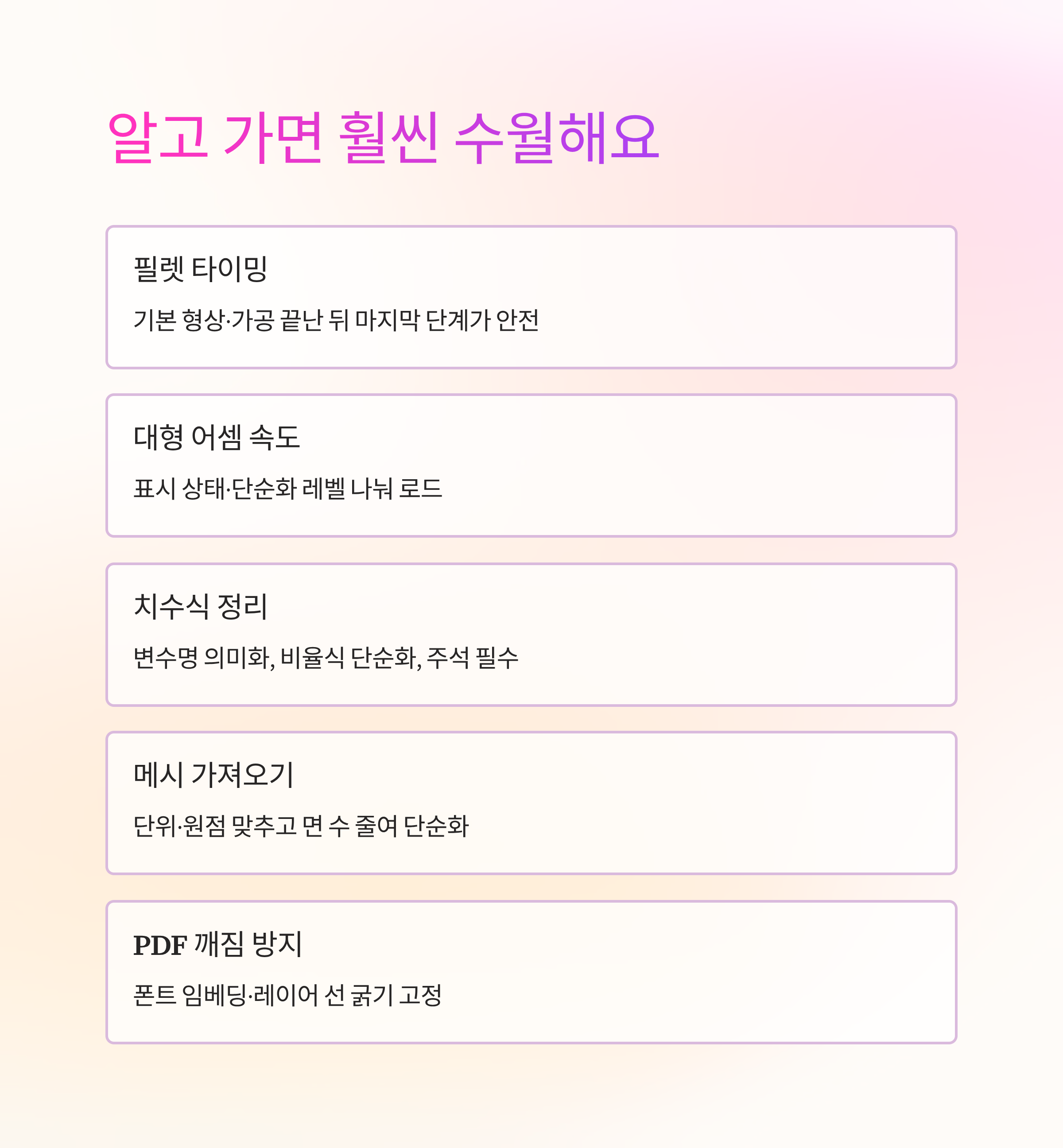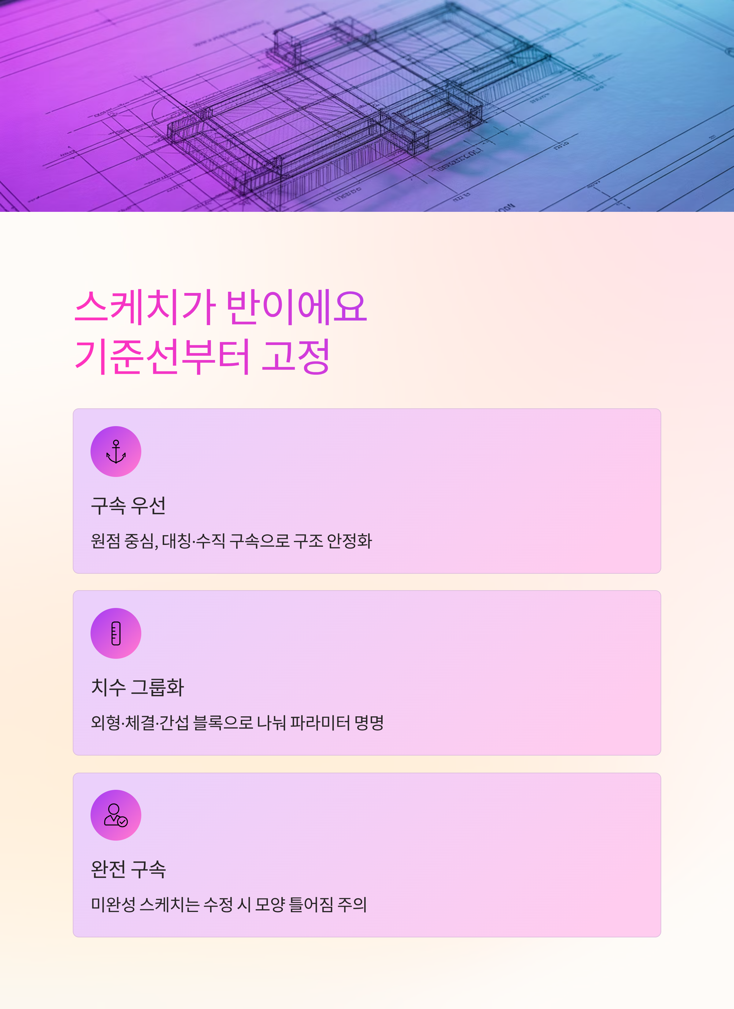 탄탄한 모델은 결국 작은 규칙의 반복에서 나오더라고요. 스케치와 피처, 어셈 규칙을 팀이 함께 지키기 시작하면 수정이 줄고 품질이 차분히 올라가요. 오늘 정리한 원칙을 템플릿과 체크리스트로 묶어 바로 써보세요. 며칠만 지나도 리빌드 시간과 에러 메시지가 눈에 띄게 줄고, 협업 속도도 훨씬 가벼워질 거예요.