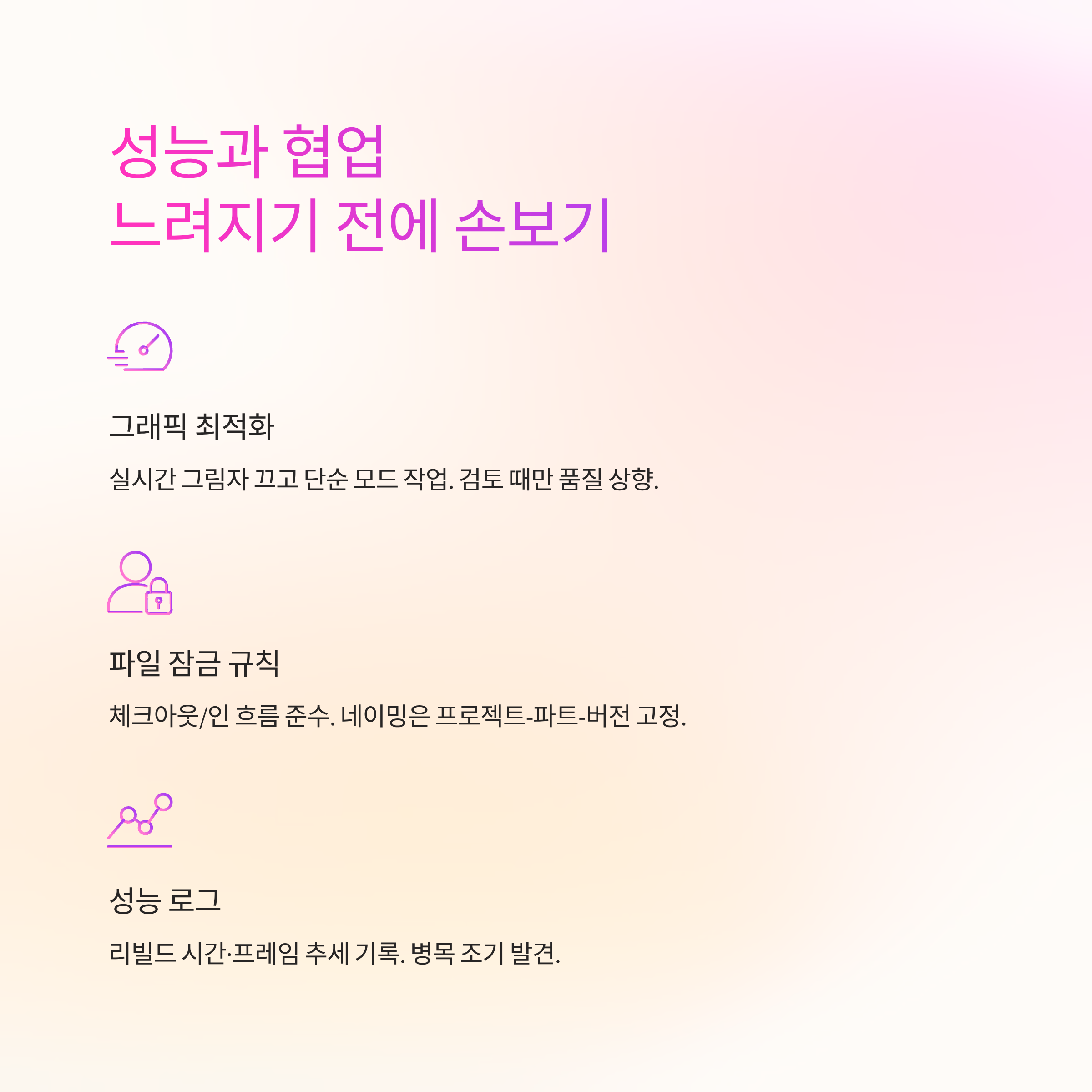 협업은 파일 잠금 규칙이 생명이에요. 체크아웃/체크인 흐름을 지키고, 네이밍은 프로젝트-파트-버전으로 고정해요. 변경 이력은 커밋 메시지에 한 줄 요약+영향 범위를 적어두면 회고가 편해요. 리소스 링크 깨짐을 막으려면 상대 경로와 공용 라이브러리를 쓰세요.
