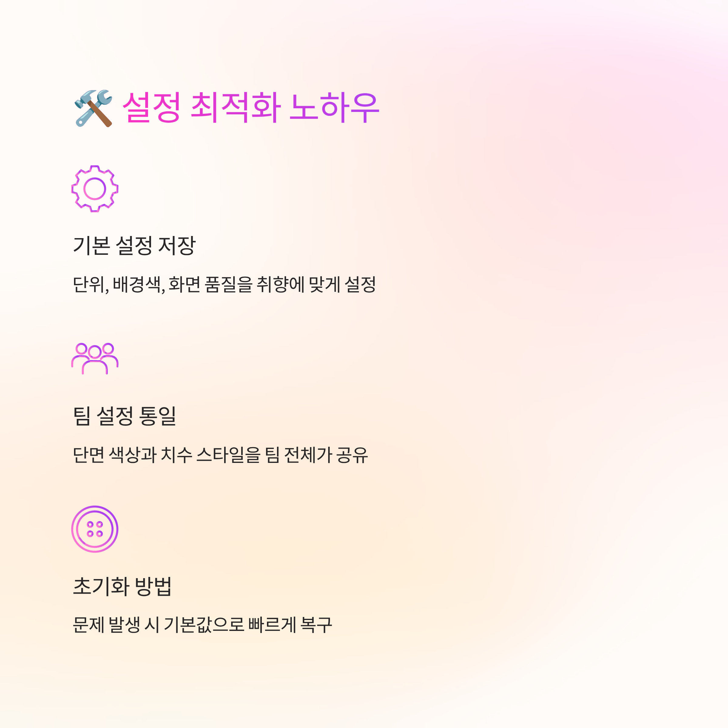 또, 문제가 생겼을 때를 대비해서 기본값으로 되돌리는 방법도 같이 알아두면 좋아요. 설정을 이것저것 만지다 보면 언제부터 화면이 이상해졌는지 헷갈릴 수밖에 없거든요. 그럴 때는 초기화 기능을 한 번 눌러 주고, 앞에서 정리해 둔 기준 설정만 다시 적용하면 금방 원래 상태로 돌아와서 마음이 한결 편해져요.