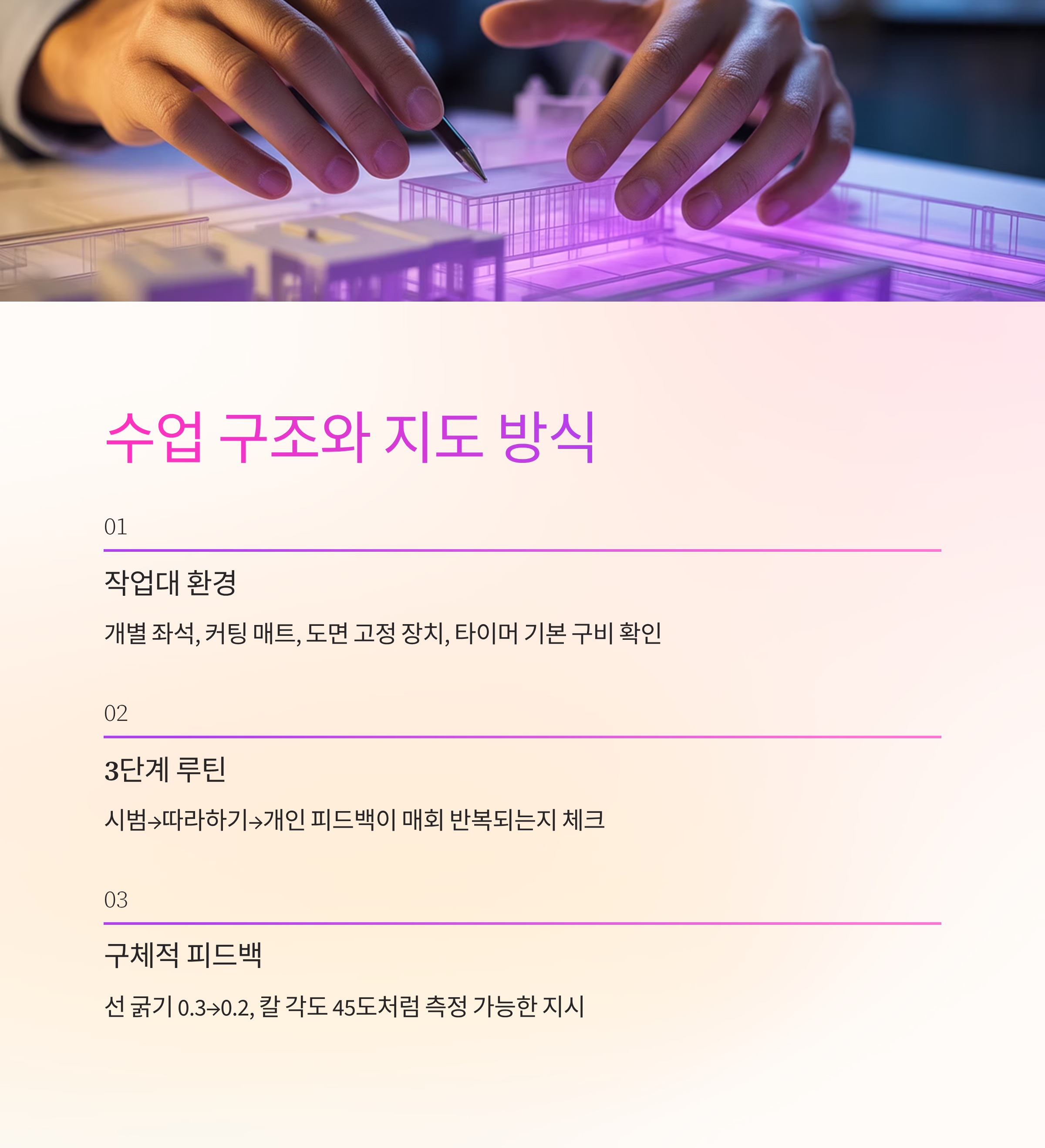 실기 준비를 혼자 하다 보면 도면은 느리고, 재료는 낭비되고, 시간은 늘 모자라더라고요. 학원을 알아보면 커리큘럼이 비슷해 보여도 막상 들어가면 차이가 꽤 커요. 핵심은 ‘시험 흐름을 몸에 붙여주는가’, 이 한 가지예요. 하루 루틴으로 제도→작도→컷팅→접착→마감까지 반복해 주고, 채점 기준에 맞춰 피드백을 잘라 주는 곳이 결국 점수를 올려줘요. 아래에서 체크리스트와 학원 고르는 요령을 정리해 볼게요.