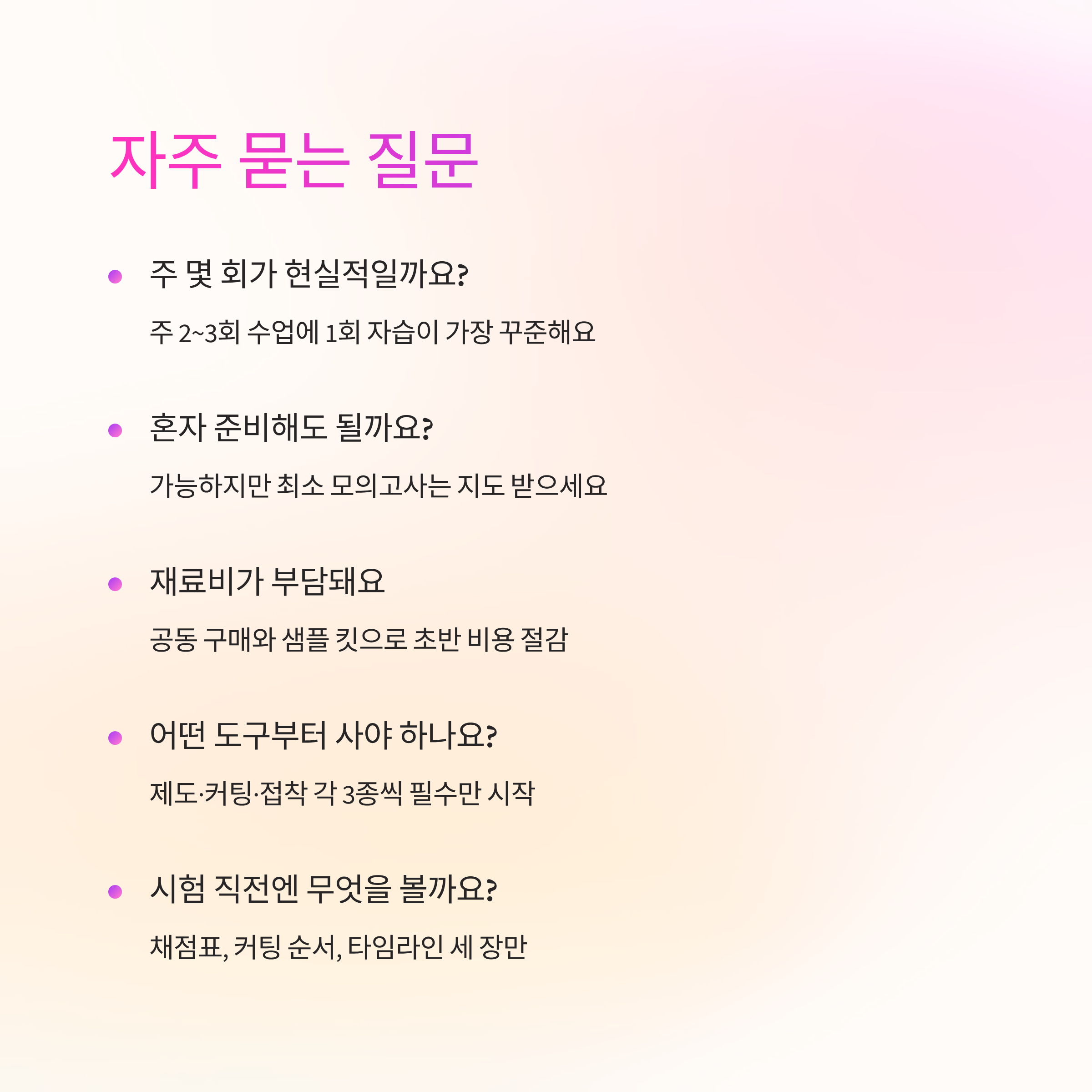 마지막으로, 주 2~3회 수업이 현실적이에요. 사이사이 자습실을 열어주는지, 재료 공동 구매로 비용을 낮춰주는지까지 보시면 선택이 쉬워집니다.