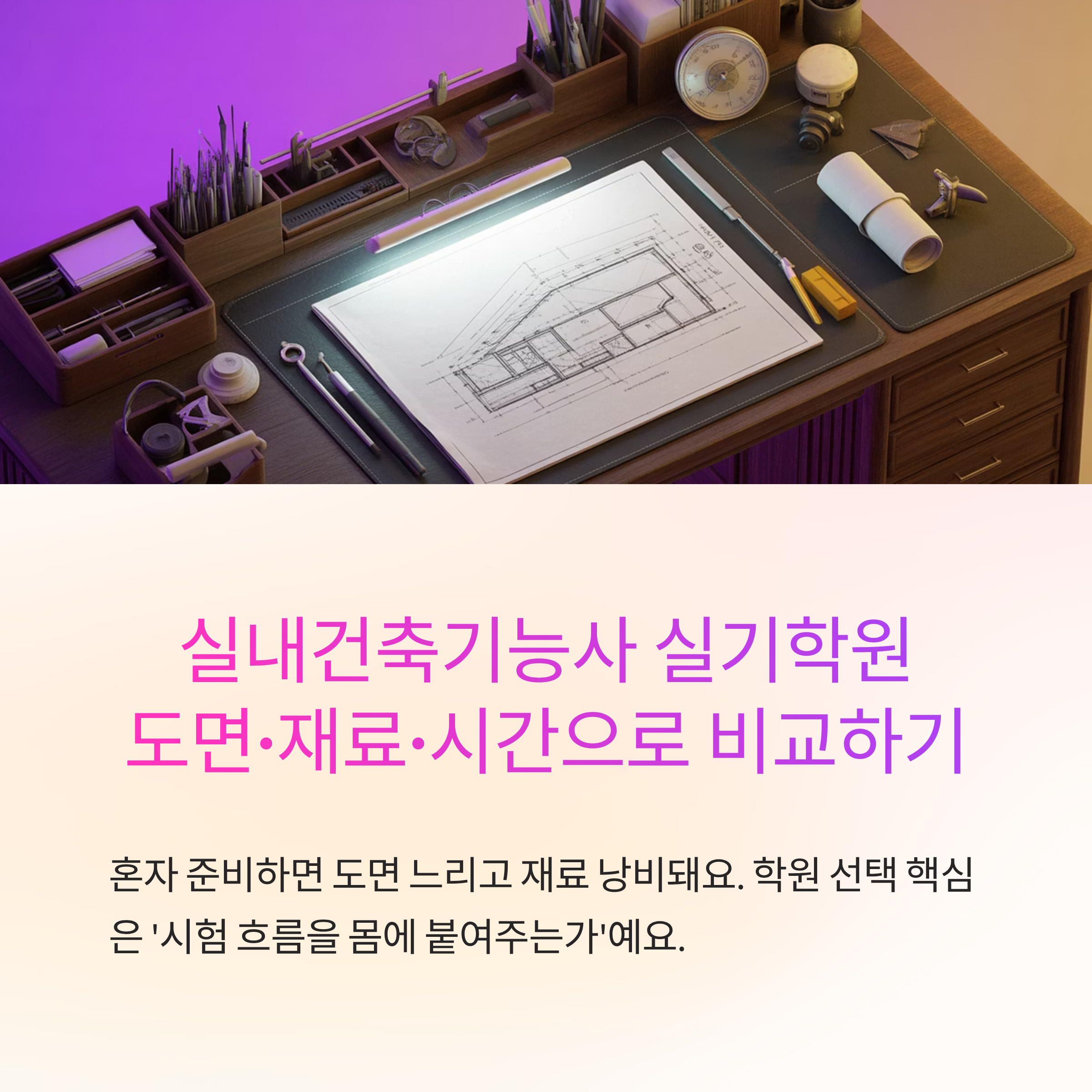 체험 수업을 꼭 들어보세요. 하루 루틴을 그대로 보여주는 곳이 믿음이 갑니다. 여기까지 맞다면 실내건축기능사실기학원 등록 후 첫 2주는 기본기 반복, 다음 2주는 모의고사 집중으로 계획을 잡아 보세요.