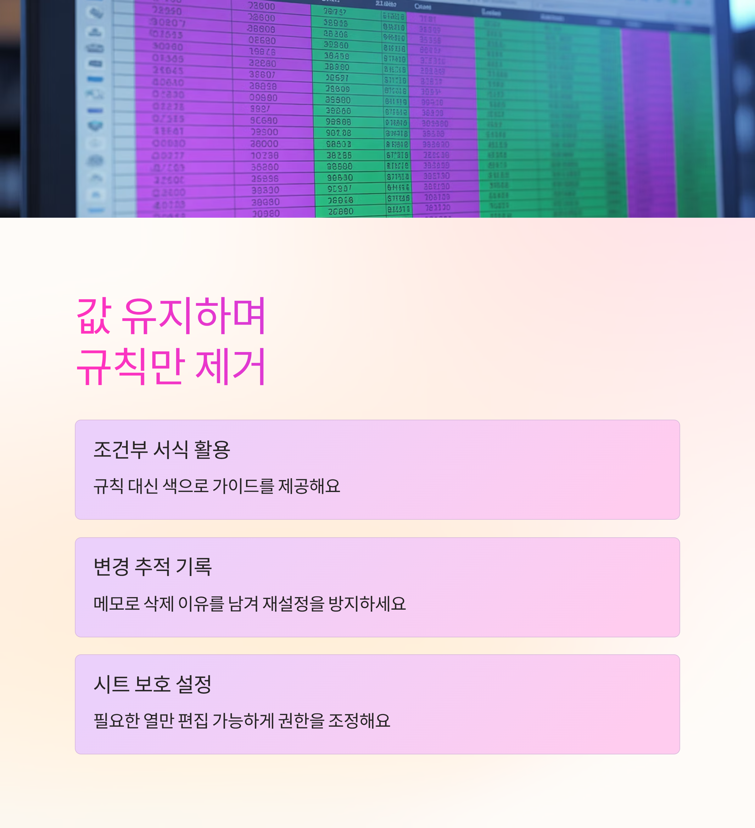 문제가 반복되면 서식 복사로 규칙이 다시 붙는지 확인하세요. 새 시트에 값만 가져와 작업하는 게 더 빠를 때도 있어요. 근본 원인을 메모로 남겨 두면 다음번엔 훨씬 수월해요.