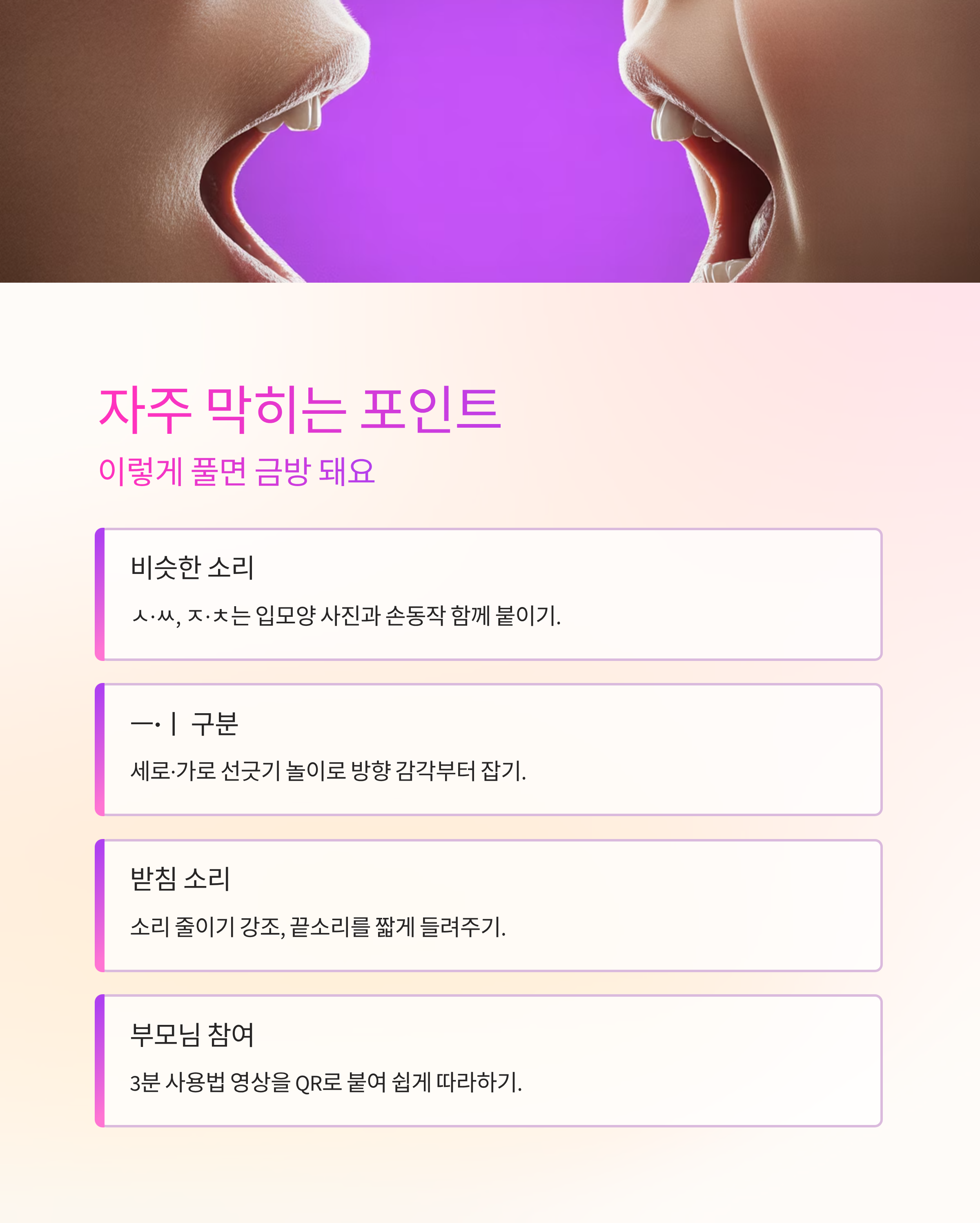 ㅅ·ㅆ, ㅈ·ㅊ처럼 비슷한 소리는 입모양 사진을 크게 보여주고 손동작을 함께 붙여요. ㅡ·ㅣ 구분이 어렵다면 세로·가로 선긋기 놀이로 방향 감각부터 잡아 주세요. 받침은 소리 줄이기를 강조해 끝소리를 짧게 들려주면 이해가 빨라요.