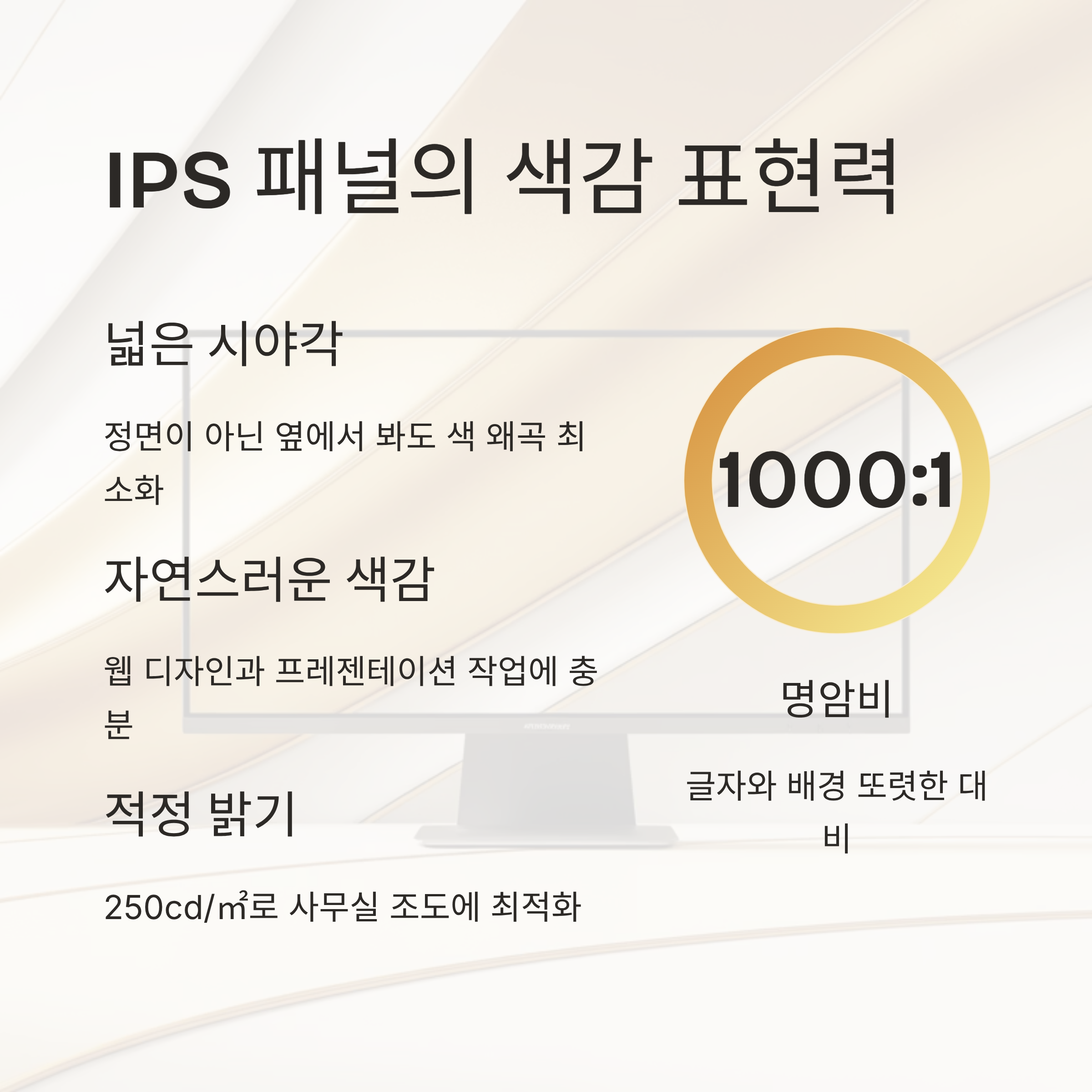 IPS 패널의 장점은 뭐니 뭐니 해도 넓은 시야각과 비교적 자연스러운 색 표현이에요. 화면을 정면이 아닌 약간 옆에서 보더라도 색이 크게 틀어지지 않고, 위아래 각도에서도 밝기가 골고루 유지되는 편이라, 모니터 위치를 자주 바꿔가며 쓰는 환경에서 특히 체감이 커요. 사진이나 영상 색감을 아주 전문적으로 맞춰야 하는 수준이 아니라면, 기본 프로필만으로도 웹 디자인이나 프레젠테이션 작업에 무리가 없는 편이에요.