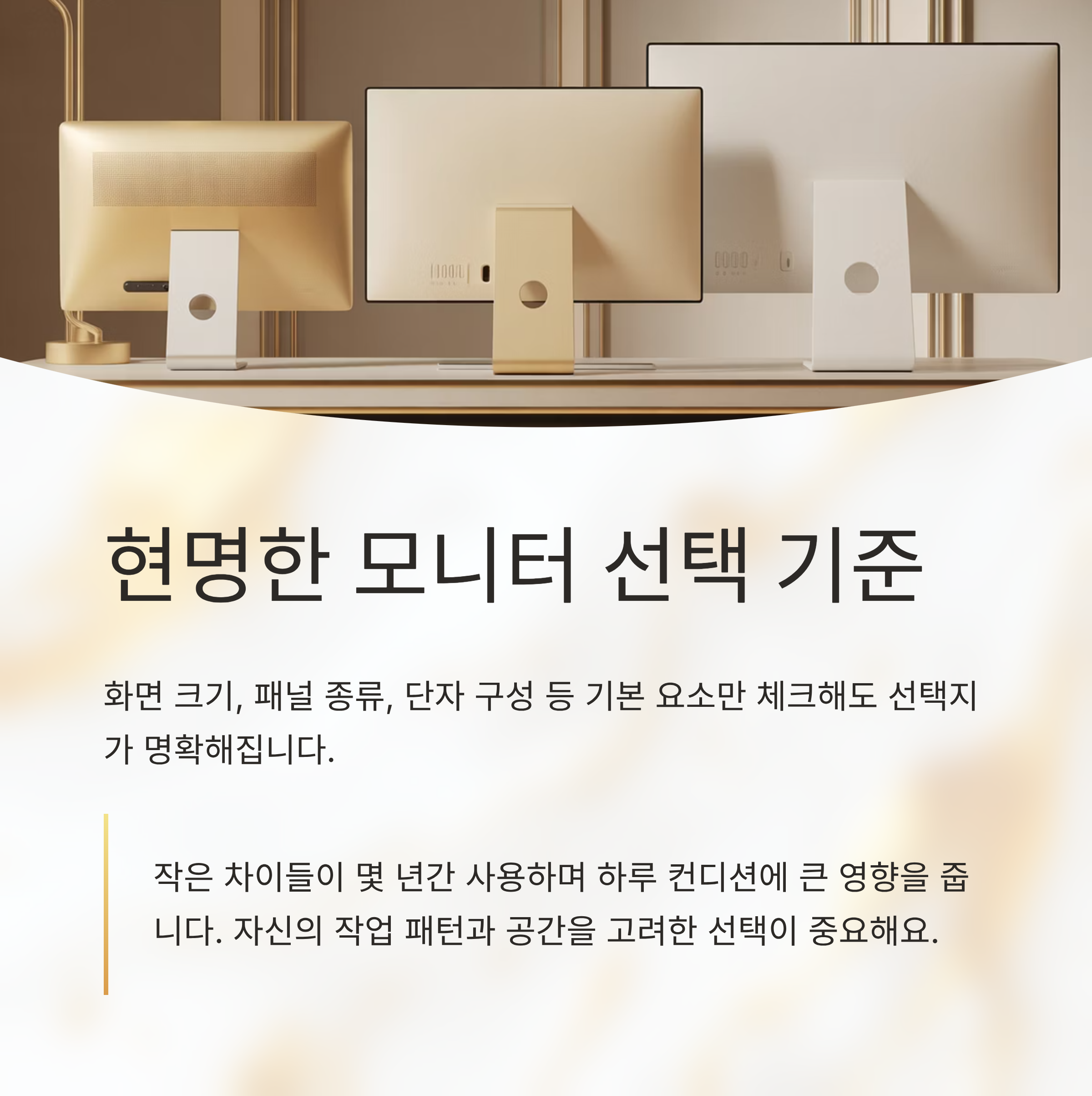 모니터를 고르는 일은 겉으로 보기에는 다 비슷해 보여서 대충 고르기 쉽지만, 막상 몇 년을 함께 쓰다 보면 작은 차이들이 하루 컨디션에 꽤 큰 영향을 준다는 걸 느끼게 돼요. 화면 크기, 패널 종류, 단자 구성처럼 기본적인 부분만 차분히 정리해도 선택지가 눈에 띄게 줄어들고, 그 안에서 디자인과 예산을 맞춰가면 생각보다 금방 마음이 정리되더라고요. 오늘 정리한 내용들이 여러분이 사용하실 공간과 작업 패턴을 떠올리면서, 내 책상 위에 가장 잘 어울릴 모니터를 고르는 데 작은 기준이 되어 줬으면 해요.