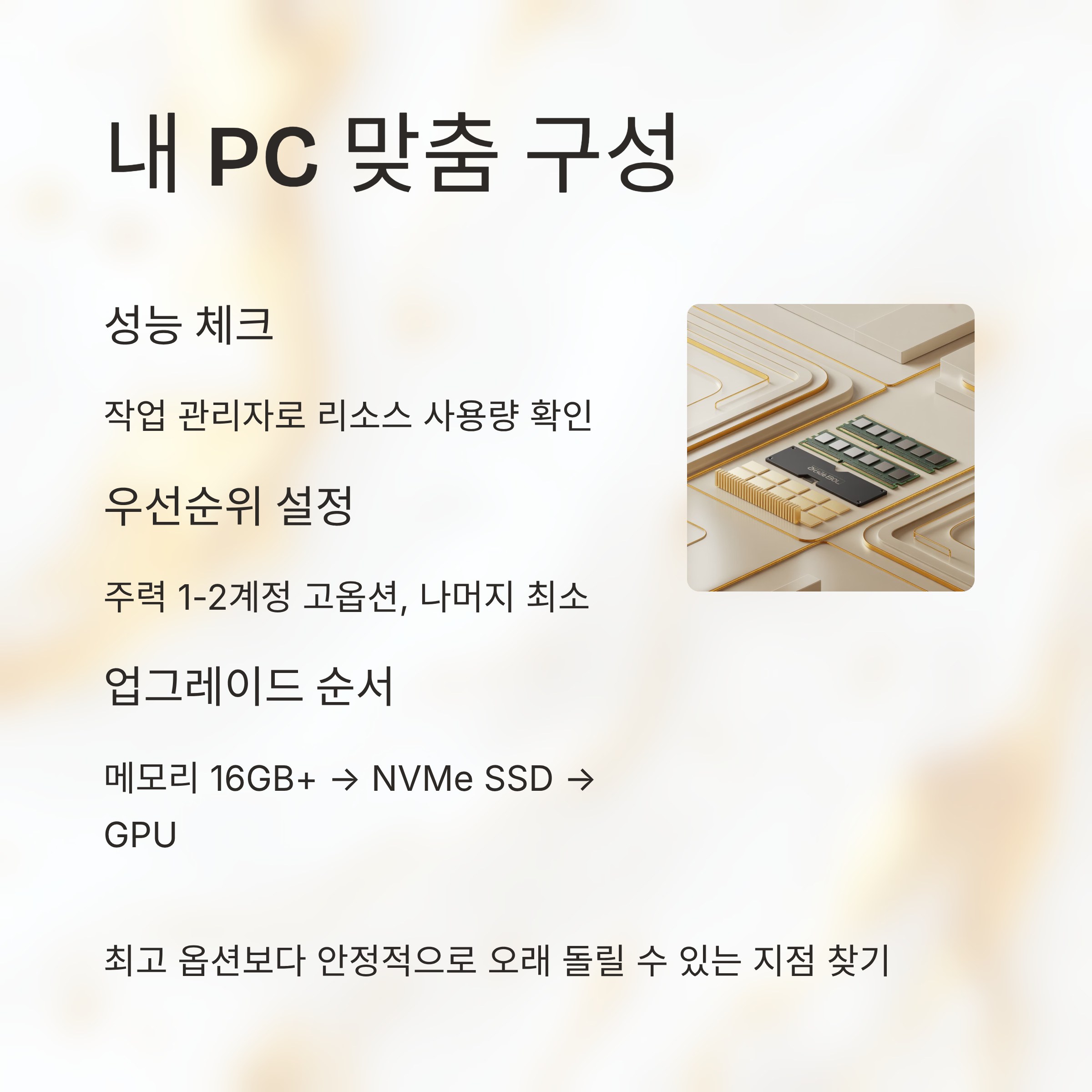 업그레이드 계획이 있다면, 먼저 메모리와 SSD처럼 체감 폭이 큰 부품부터 손대 보는 걸 추천해요. 게임뿐 아니라 전체 PC 사용 경험이 함께 좋아지기 때문에, 단순히 한 게임을 위한 투자가 아니라 일상 전반을 편하게 만드는 쪽에 더 가깝거든요. 이렇게 차근차근 환경을 정리하다 보면, 어느 순간 “이 정도면 여러 캐릭터를 돌려도 크게 무리가 없다”라는 자신감이 생기게 될 거예요.