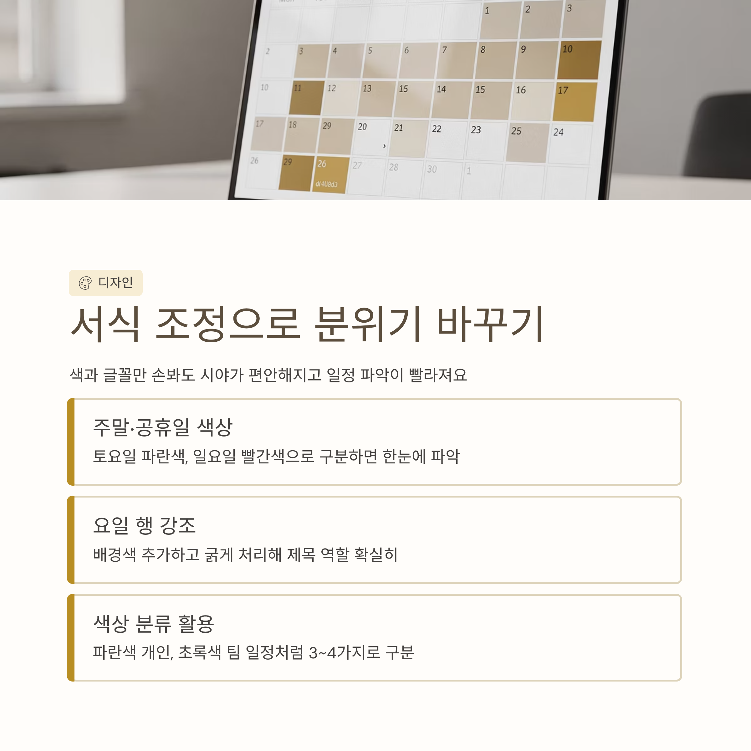 많은 분들이 숫자만 맞게 들어가면 끝이라고 생각하시는데, 색과 글꼴만 조금 손봐도 시야가 훨씬 편안해져요. 주말이나 공휴일을 살짝 다른 색으로 표시해 두면 일정이 몰린 구간을 훨씬 빨리 파악할 수 있어서 업무 조율할 때도 도움이 되더라고요.