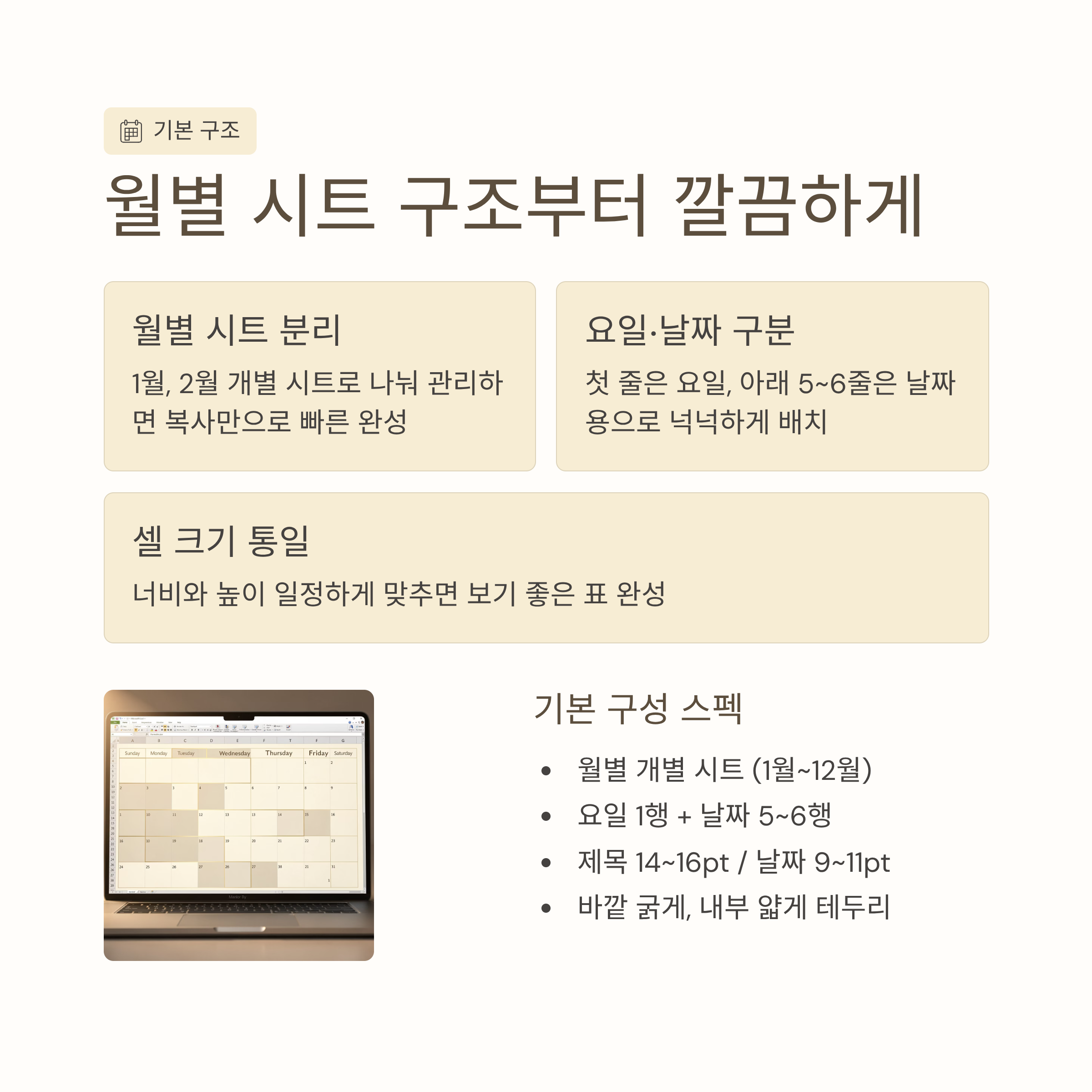| 중요 포인트 | 요일 행, 날짜 영역, 색상 규칙을 미리 정해 두면 수정할 일이 크게 줄어들어요. |