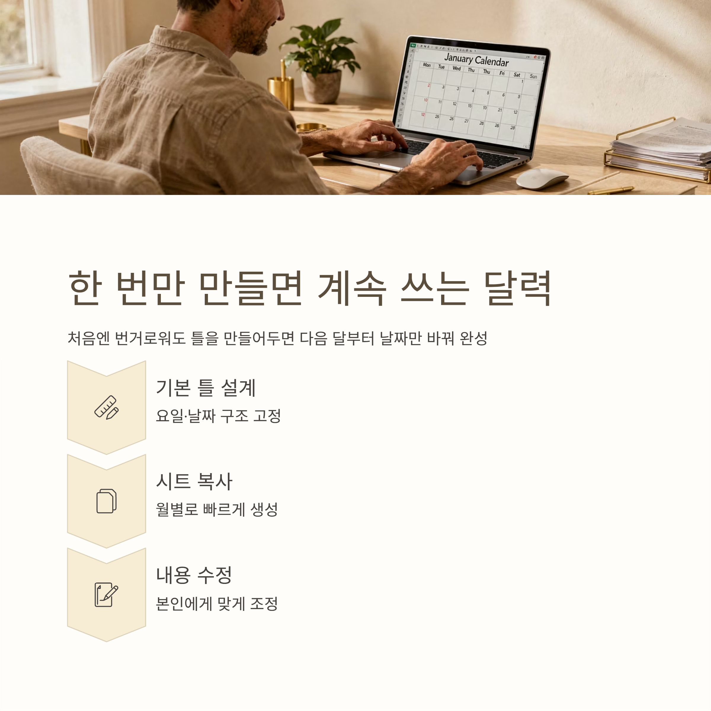 | 핵심 1줄 | 첫 달만 제대로 만들어 두면 나머지는 복사와 수식으로 빠르게 완성 가능해요. |