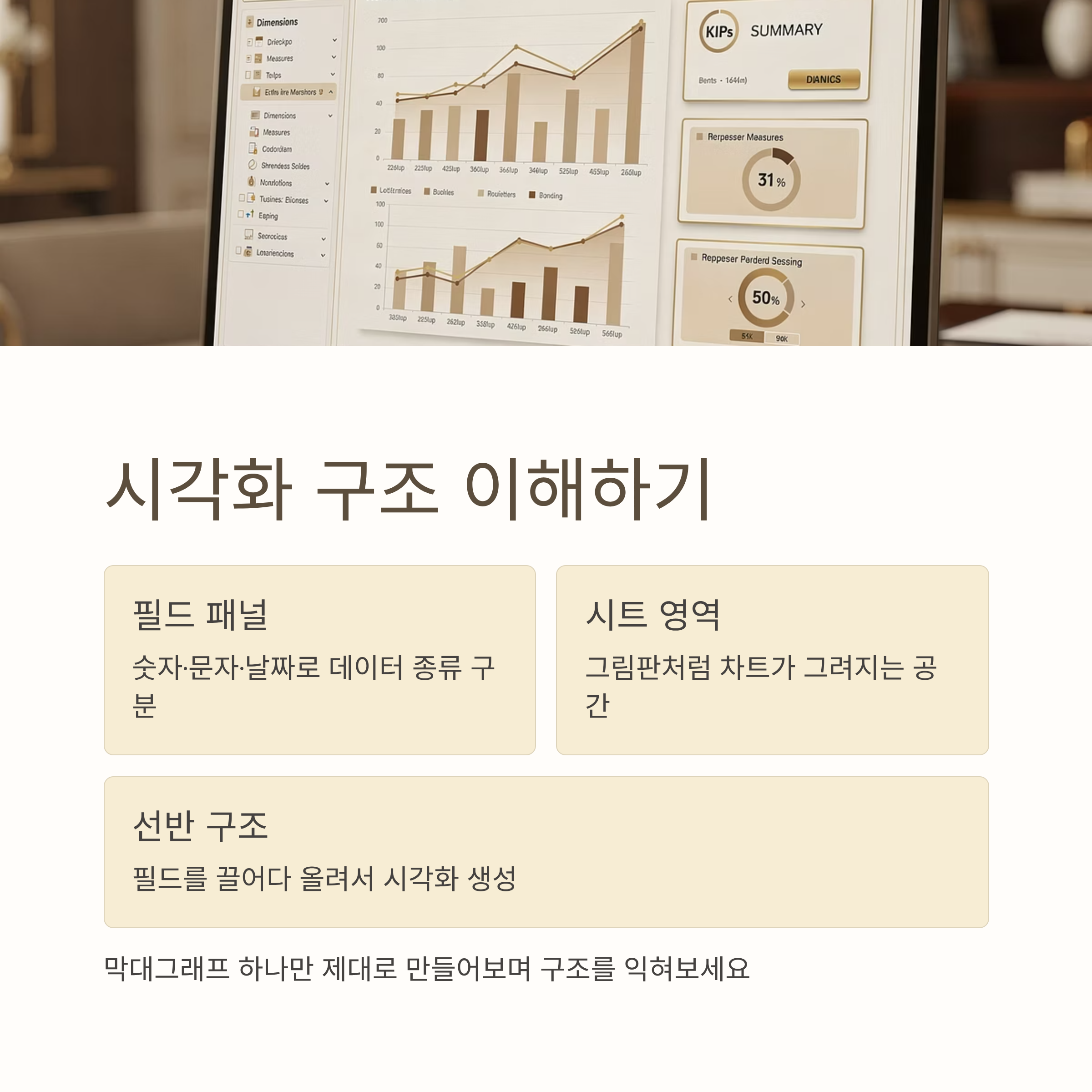 | 핵심 1줄 | 화면 구성 이해 → 스토리 있는 대시보드 → 정리된 데이터 순으로 접근하면 훨씬 수월해져요. |