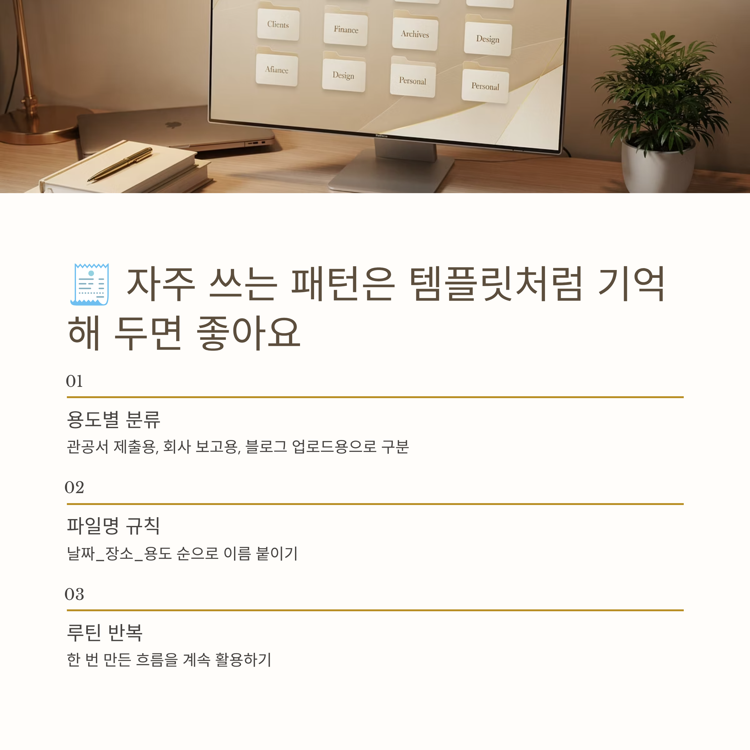 이 흐름을 한 번만 제대로 만들어 두면 그다음부터는 같은 루틴만 반복하면 되니까 머리가 한결 가벼워져요. 진짜 나중에 작업하다 보면 “아 이래서 초반에 정리해두면 편하다 했구나” 싶은 순간이 딱 오거든요. 작은 수고로 뒤에 생길 번거로움을 미리 줄여 두는 느낌이라고 보시면 돼요.