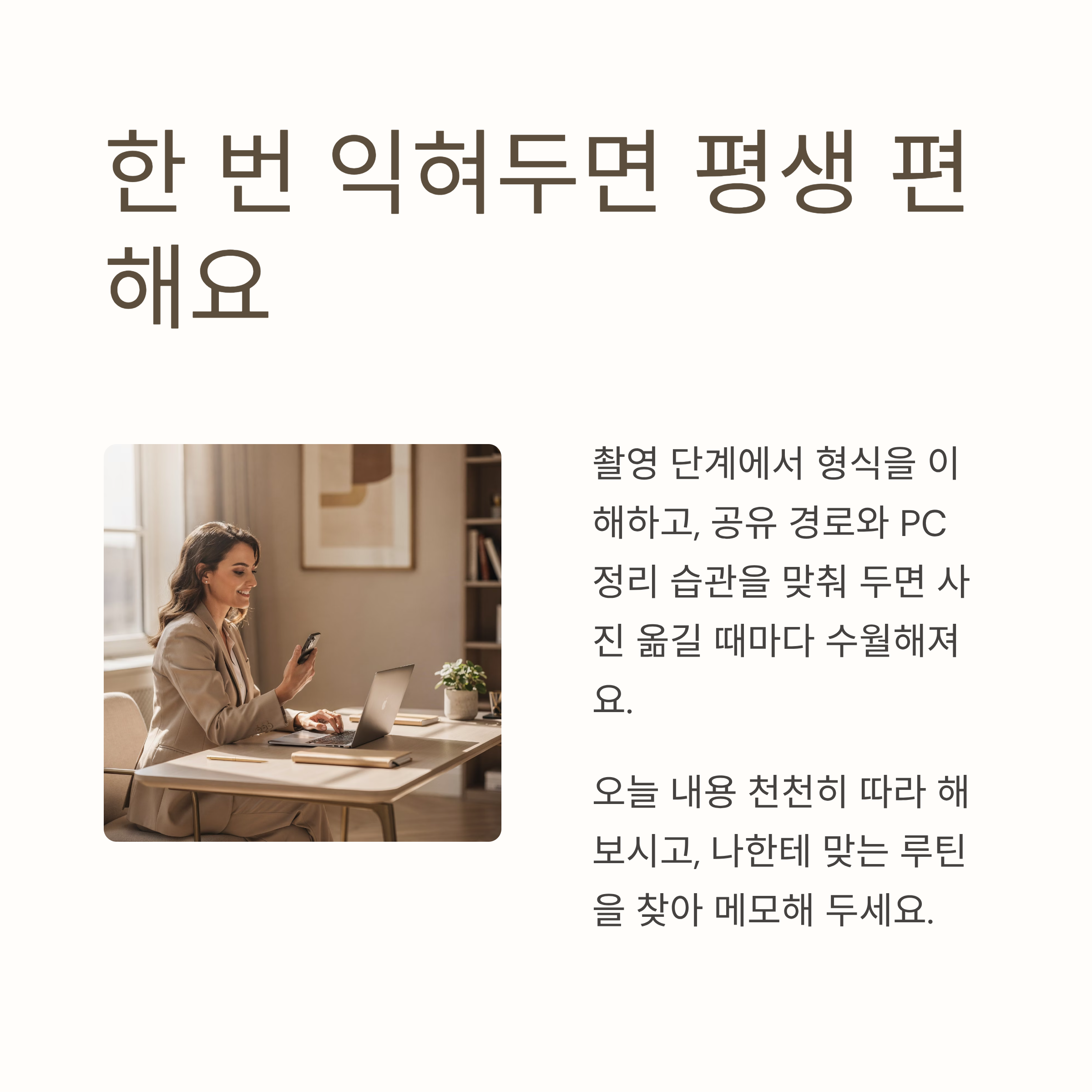 | 중요 포인트 | 새로 찍는 사진과 이미 찍어 둔 사진을 분리해서 생각하고, 원본 보관 폴더를 따로 만들어 두는 게 좋아요. |