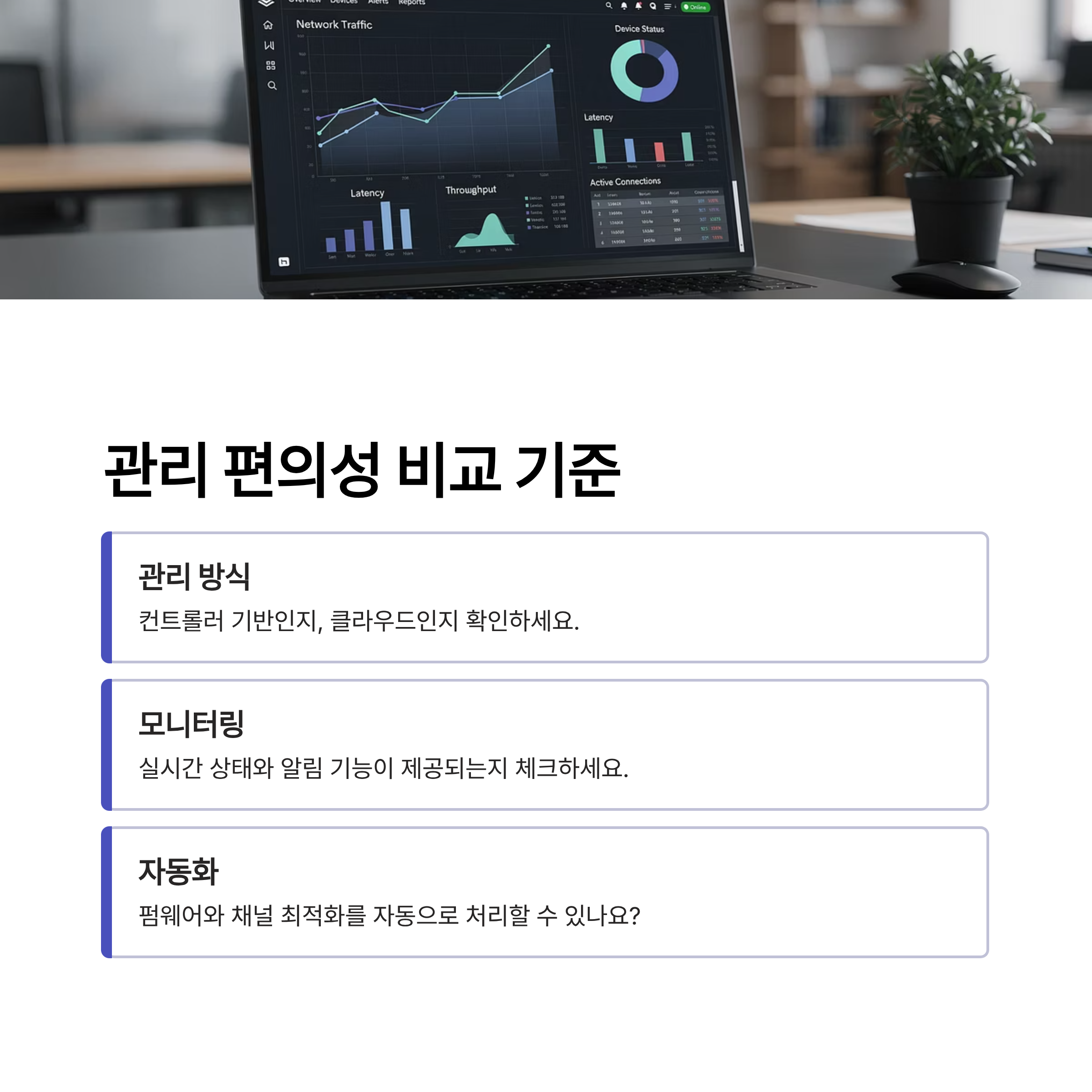 | 관리 방식 | 컨트롤러 기반인지, 클라우드인지, 단독 관리인지 확인 |