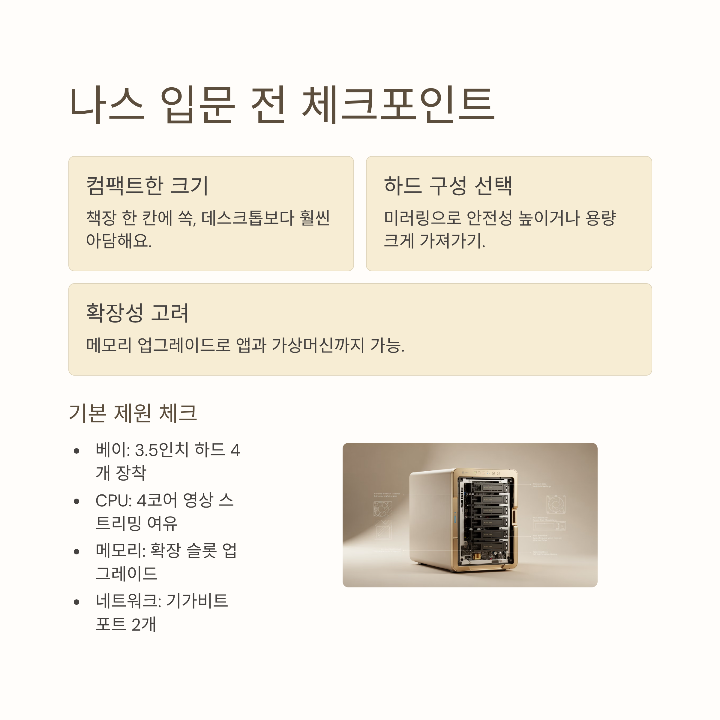 처음 네트워크 저장장치를 들이면 제일 먼저 느끼는 게 “생각보다 작네?” 하는 본체 크기예요. 데스크톱에 비하면 훨씬 아담해서 책장 한 칸이나 모니터 옆 공간에 쏙 들어가거든요. 대신 안에 들어가는 하드는 최소 두 개 이상 쓰는 경우가 많아서, 실제 저장공간과 예산을 같이 계산해봐야 헷갈리지 않아요.