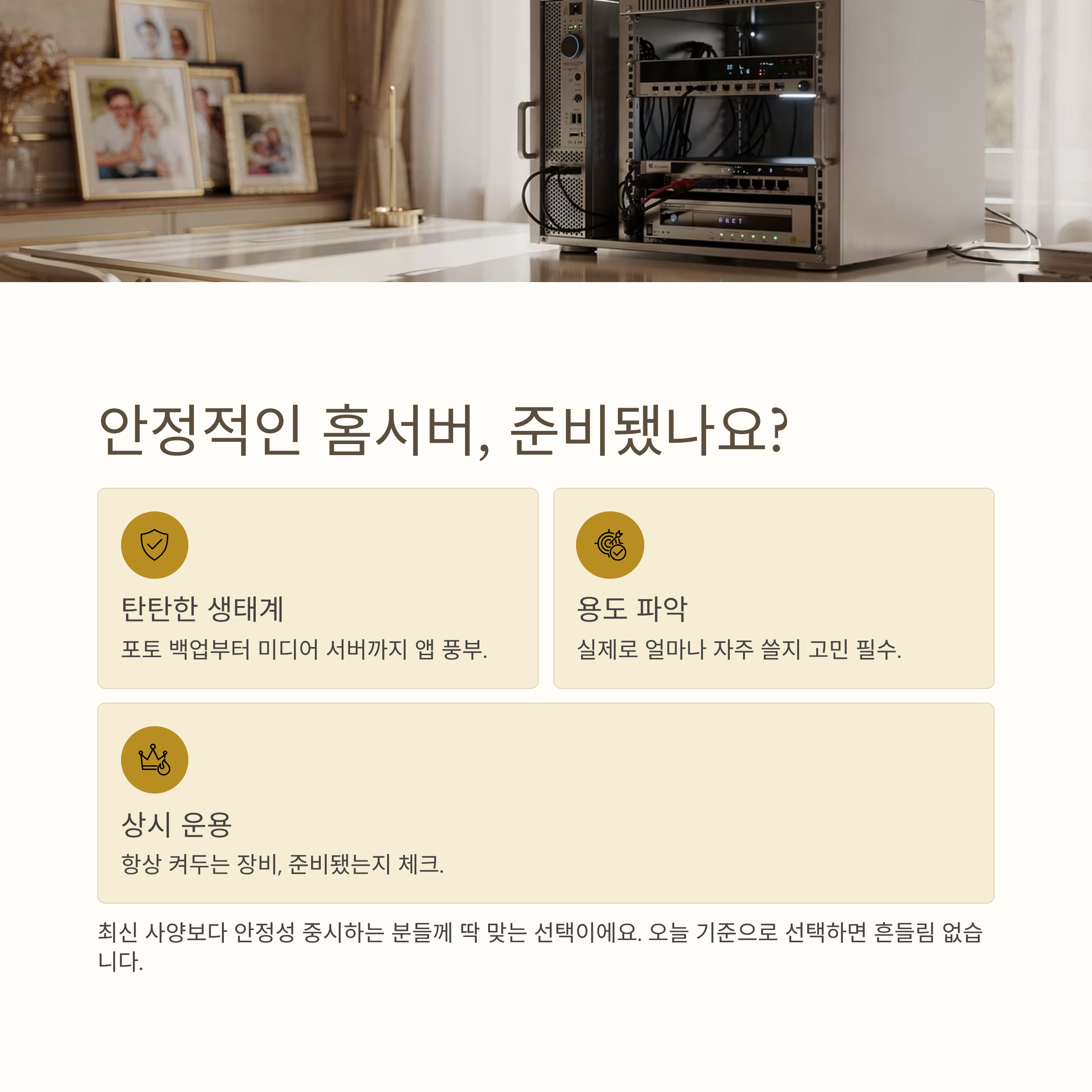 전체적으로 보면 이 제품은 최신 사양에 목숨 걸지 않고, 안정적인 파일 저장소와 홈서버를 만들고 싶은 분들에게 잘 맞는 쪽에 가까워요. 이미 나와 있는 앱 생태계도 탄탄해서, 포토 백업부터 미디어 서버까지 필요한 기능들을 하나씩 켜보는 재미가 있거든요. 결국 중요한 건 집에서 실제로 어떤 용도로 얼마나 자주 쓸지, 그리고 항상 켜두는 장비를 들일 준비가 됐는지 이 두 가지예요. 오늘 이야기한 기준만 머릿속에 정리해두면, 새 제품이든 중고든 선택할 때 훨씬 덜 흔들리실 거예요.