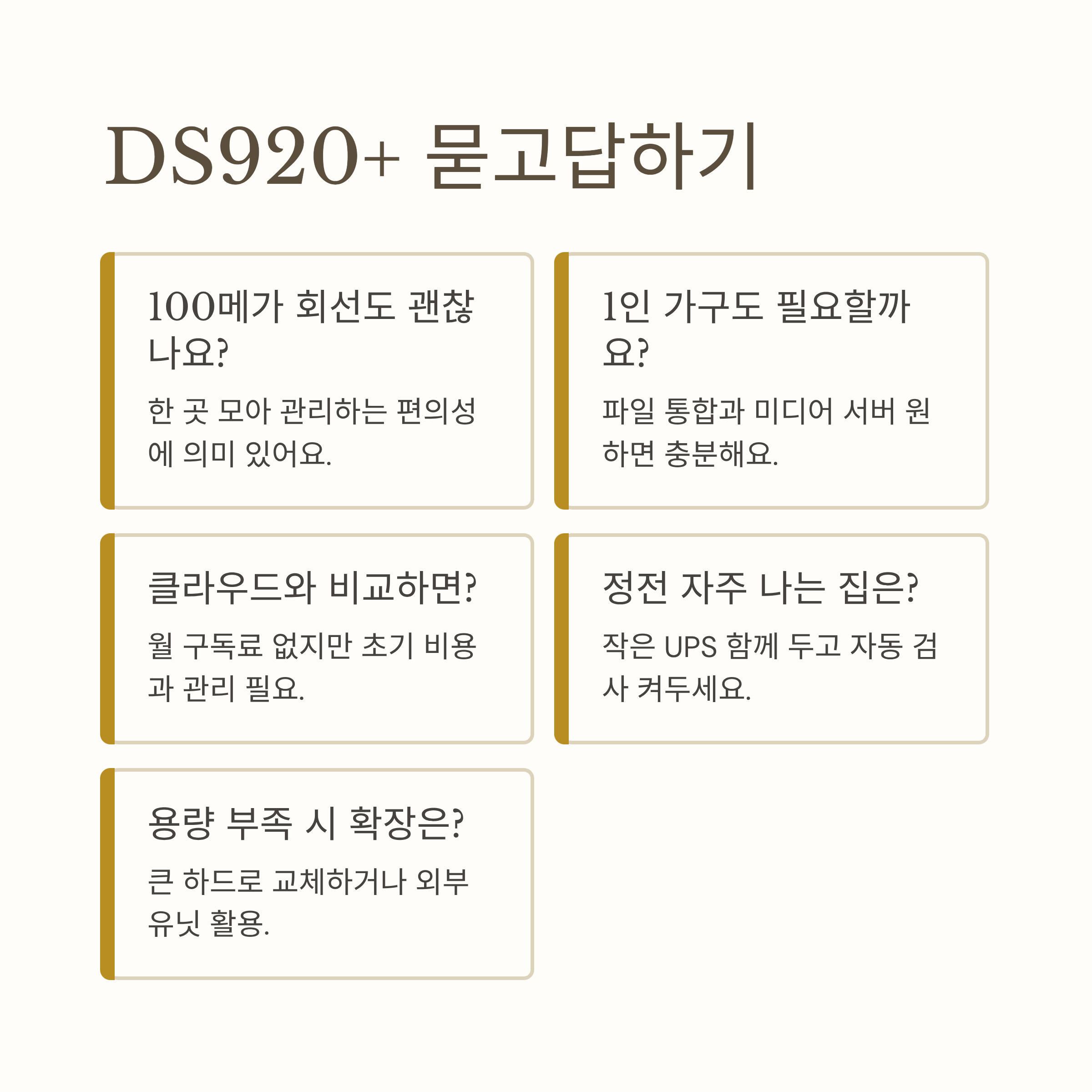 집에서 사진이랑 영상이 점점 쌓이다 보면 외장하드도 모자라고, 누가 어느 폴더에 뭘 넣었는지 헷갈릴 때가 많아요. 그러다 검색하다 보면 DS920+ 같은 나스 제품이 눈에 들어오고, 이걸로 가족 사진이랑 영화까지 한 번에 정리해볼까 고민이 시작되죠. 막상 들이기 전에 소음이나 속도, 전기요금 같은 걱정 때문에 망설이게 되는데요. 실제로 써보는 입장에서 어떤 느낌인지, 선택 전에 체크하면 좋은 포인트를 하나씩 정리해볼게요.