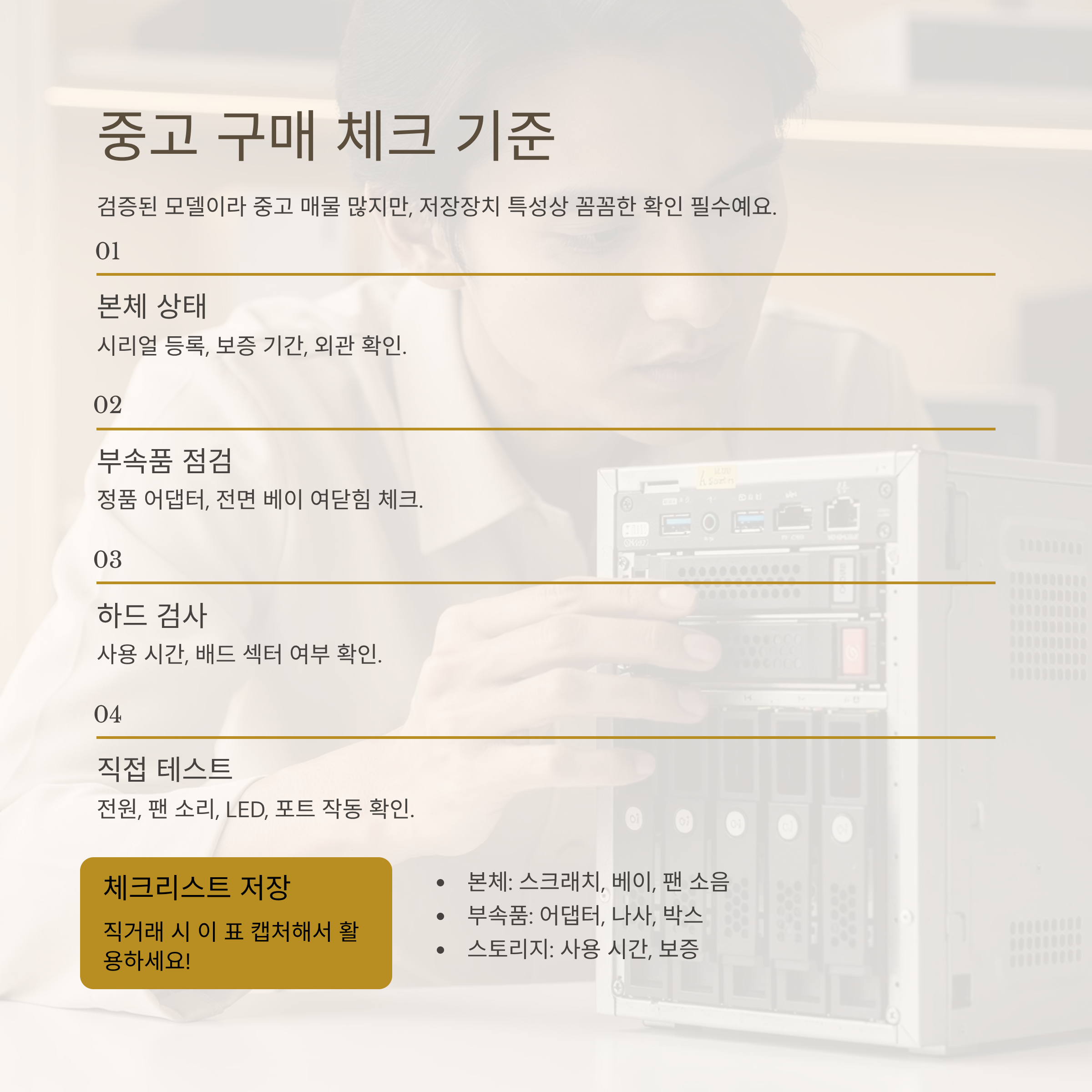 이제는 새 제품보다 중고로 알아보는 분들도 많이 보여요. 이미 몇 년은 검증된 모델이라 중고 매물이 꾸준히 나오거든요. 다만 저장장치 특성상 아무 생각 없이 저렴한 것만 보고 고르면, 나중에 하드 상태 때문에 또 돈이 드는 경우가 있어요.