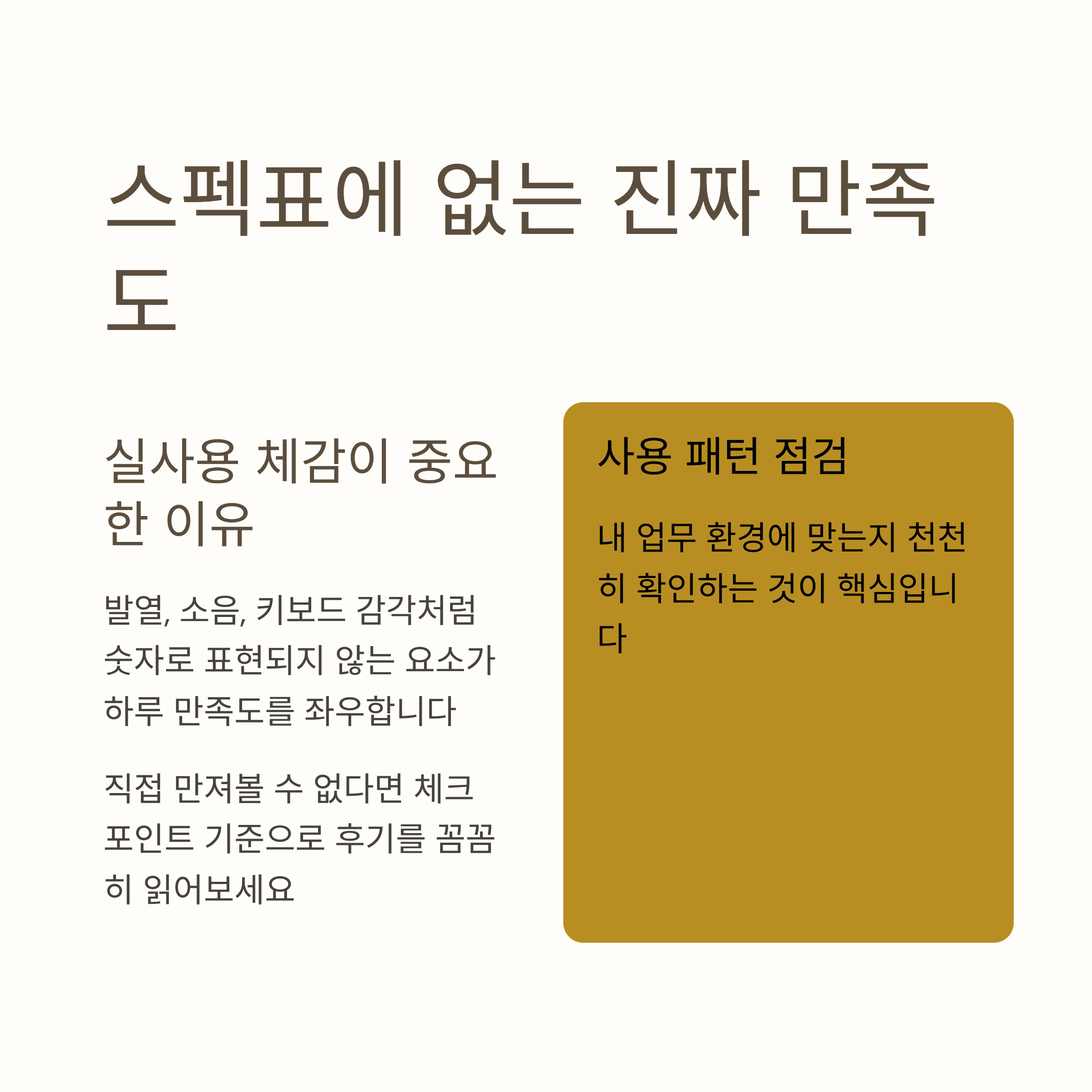 노트북을 고를 때 스펙표만 보고 결정하면 나중에 의외의 불편함이 튀어나오는 경우가 많아요. 실제로는 발열, 소음, 키보드 감각처럼 스펙으로는 잘 드러나지 않는 부분이 하루 사용 만족도를 크게 좌우하더라고요. 그래서 직접 만져볼 수 없다면, 이런 체크 포인트들을 기준으로 후기를 꼼꼼히 읽어 보는 게 좋아요. 오늘 정리한 내용이 여러분이 업무용이나 학습용 노트북을 고를 때, 내 사용 패턴에 맞는지 천천히 점검해 보는 기준이 되었으면 좋겠어요.