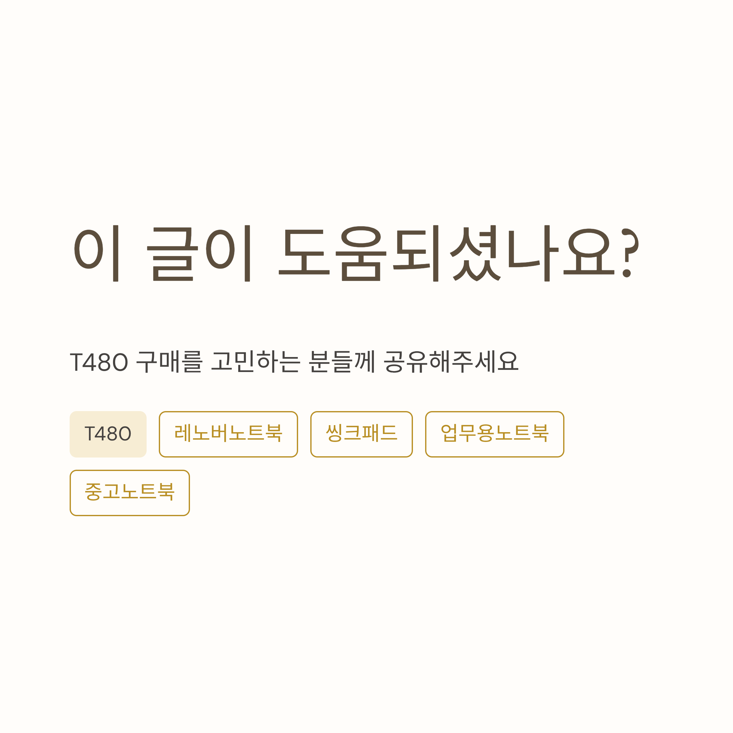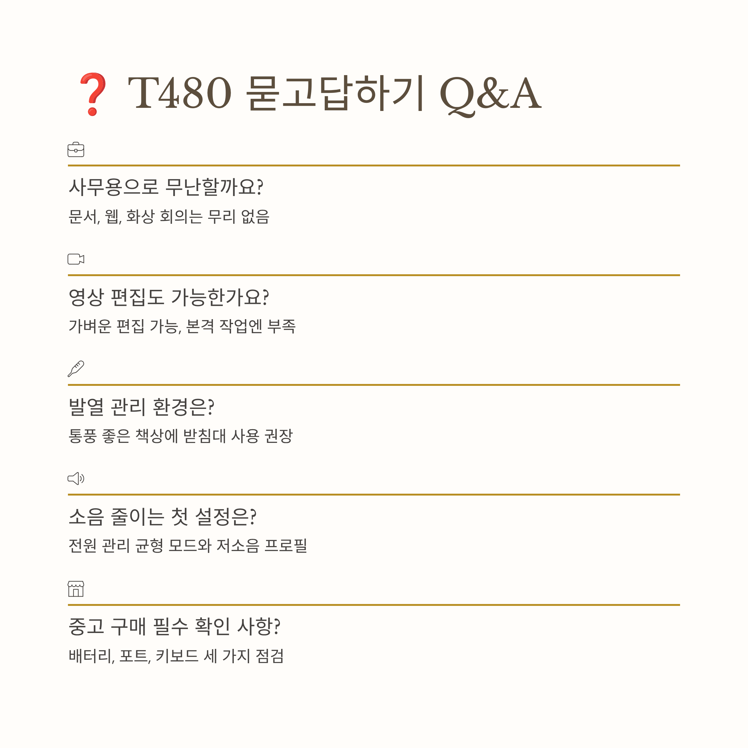 노트북 하나를 오래 쓰다 보면 처음엔 잘 느끼지 못했던 불편함이 슬슬 쌓이기 시작하죠. 특히 회사에서 지급받은 모델이나 중고로 들인 제품은 내가 직접 골라서 산 게 아니다 보니 장단점을 파악하는 데 시간이 좀 걸려요. 저도 T480을 쓰면서 발열이랑 팬 소음, 배터리 같은 부분이 궁금해서 하나씩 체크해 봤어요. 지금 사용을 고민 중이시라면 어떤 점을 보고 판단하면 좋을지 같이 정리해 볼게요. 여러분은 주로 어떤 작업에 가장 많이 쓰실 예정이신가요?