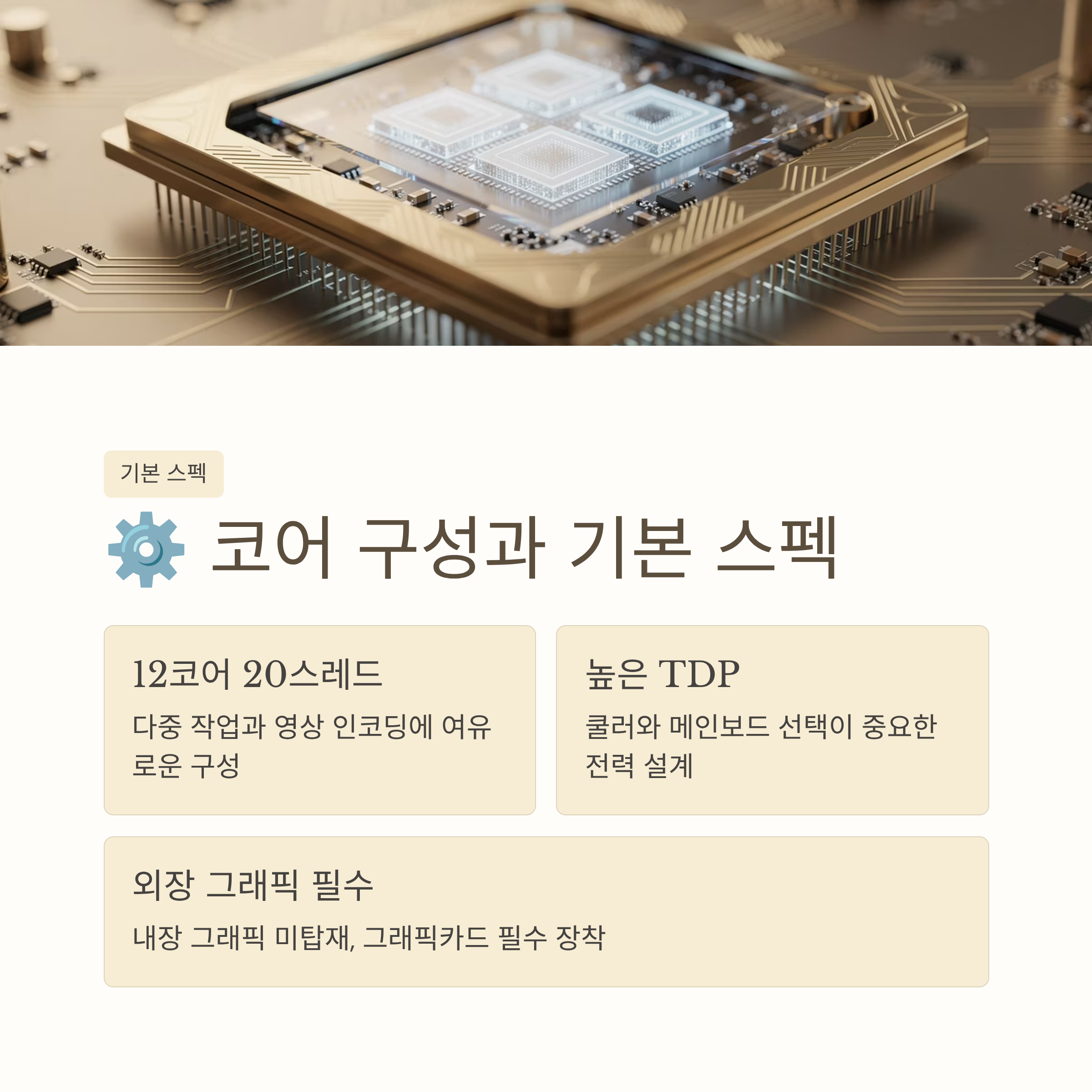 | 요약 2 | 방송 송출·영상 편집처럼 멀티코어를 쓰는 작업에서는 코어 수와 스레드 수가 든든하게 느껴져요. |