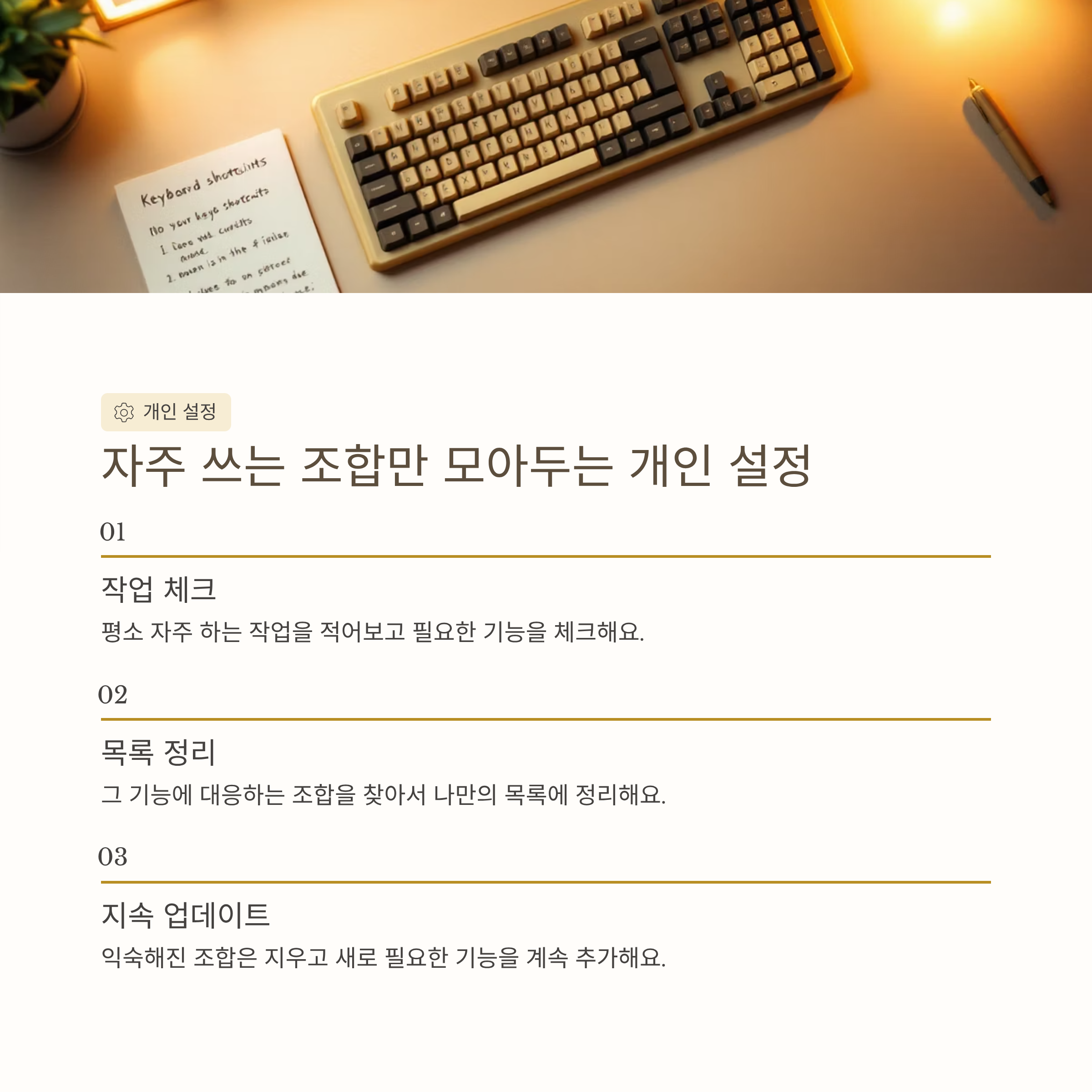 모든 조합을 다 외우려 하기보다는, 나에게 필요한 것만 골라서 목록을 만드는 방식이 훨씬 효율적이에요. 평소에 어떤 작업을 자주 하는지 떠올려 보시고, 그때마다 손이 많이 가는 기능을 따로 적어보시면 금방 패턴이 보이거든요. 이렇게 추린 조합을 모아두면 실무에서도 바로 써먹을 수 있는 작은 레퍼런스가 돼요.