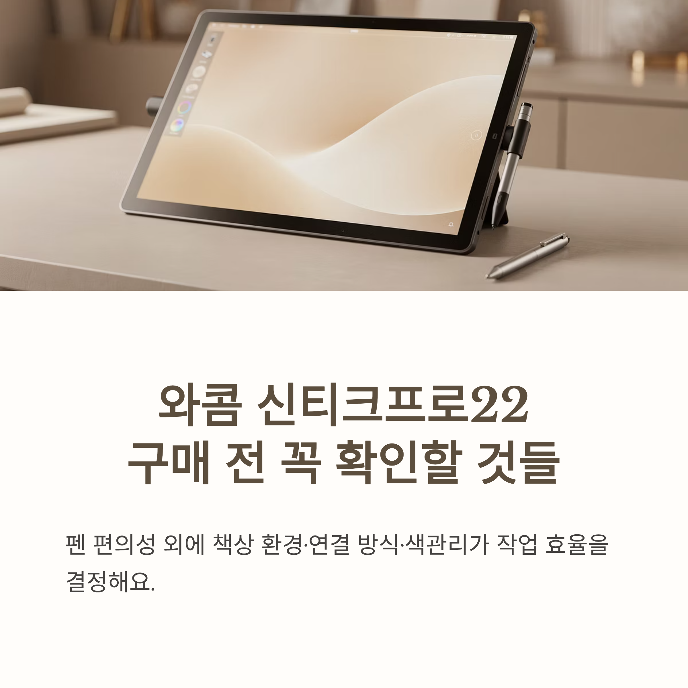 와콤신티크프로22를 기준으로 보면, 책상 깊이·연결 방식·색관리 루틴이 실제 작업 효율을 좌우해요.