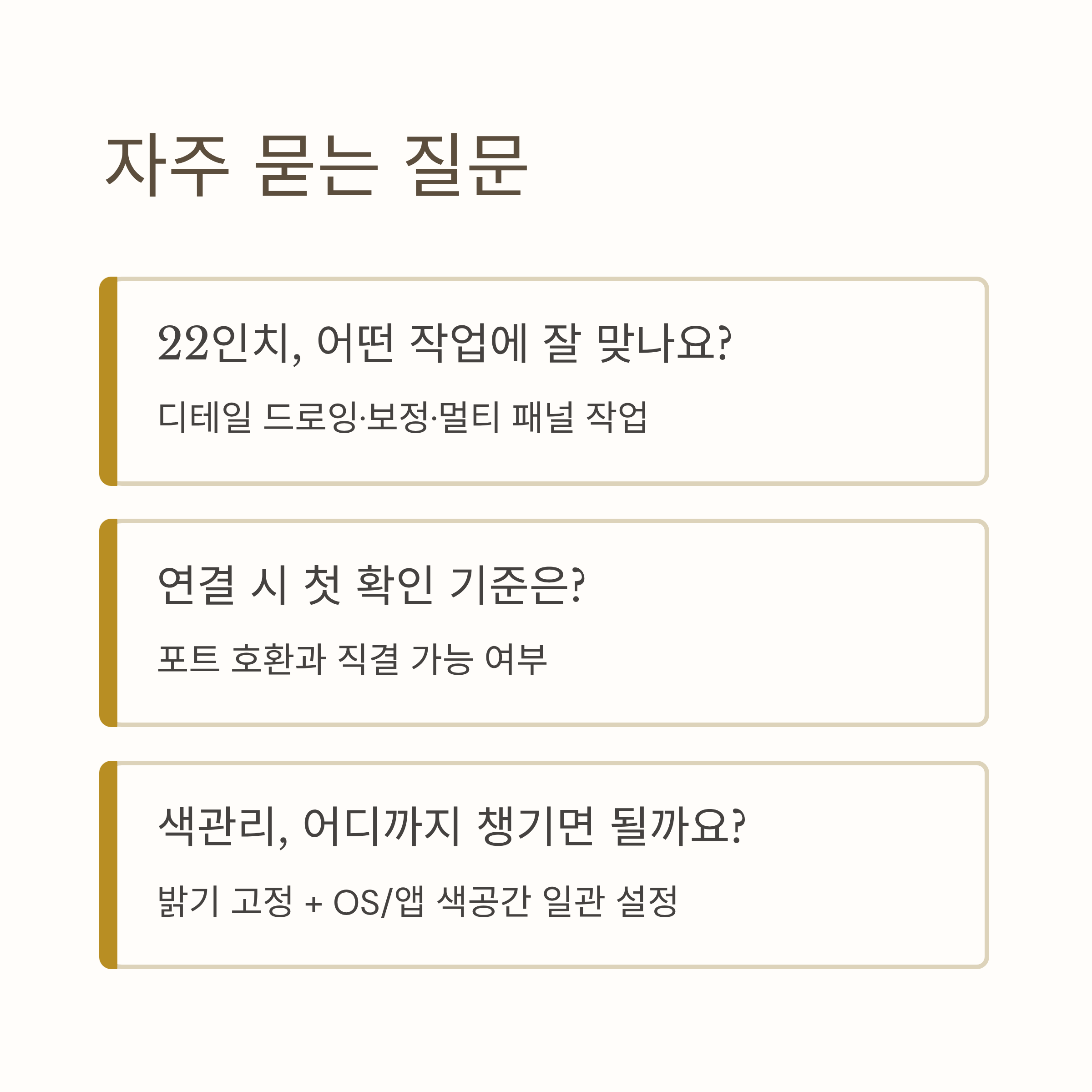 | 색관리는 어디까지 챙기면 충분할까요? | 밝기·주변광을 고정하고, OS/앱 색공간 설정부터 일관되게 맞추는 게 1순위예요. |