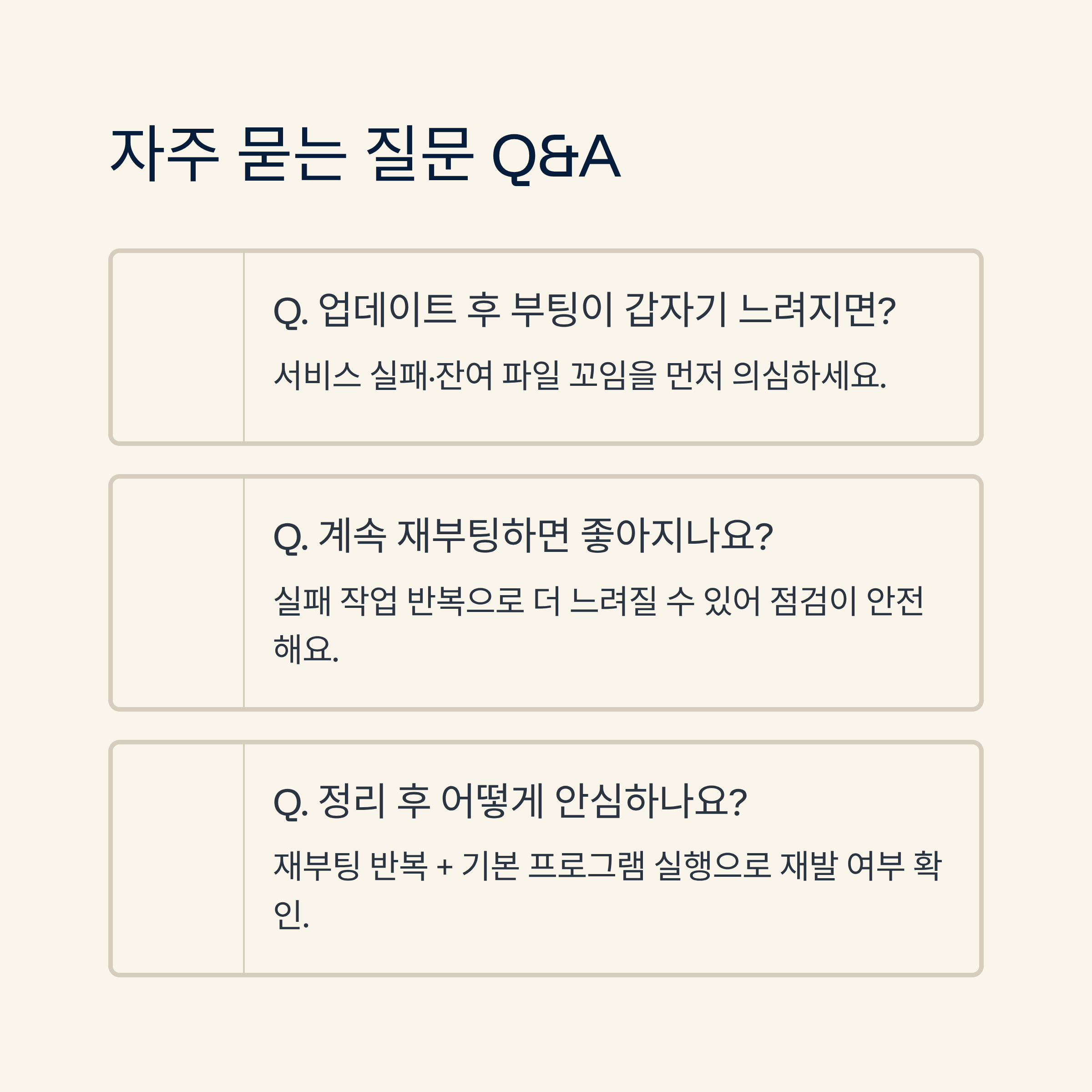 | 정리 후 어떤 확인을 해야 안심할 수 있나요? | 재부팅 반복과 기본 프로그램 실행으로 재발 여부를 봐요. |