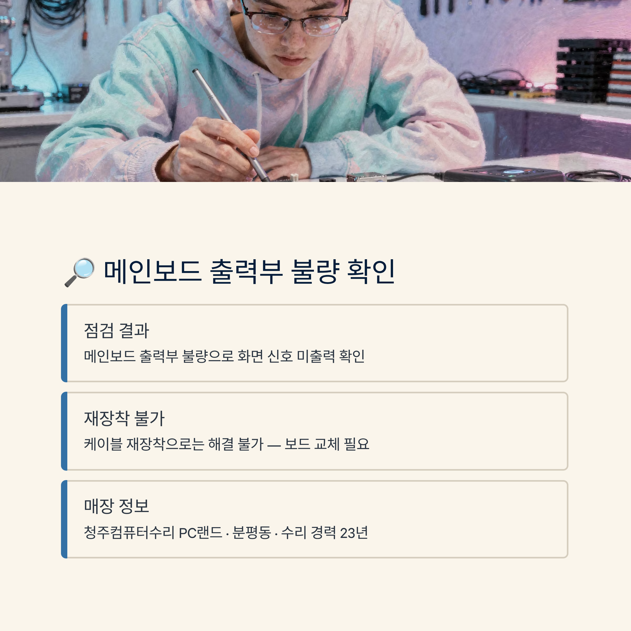 | 핵심 개념 | 메인보드 출력부 불량을 보드 교체로 정상화 |