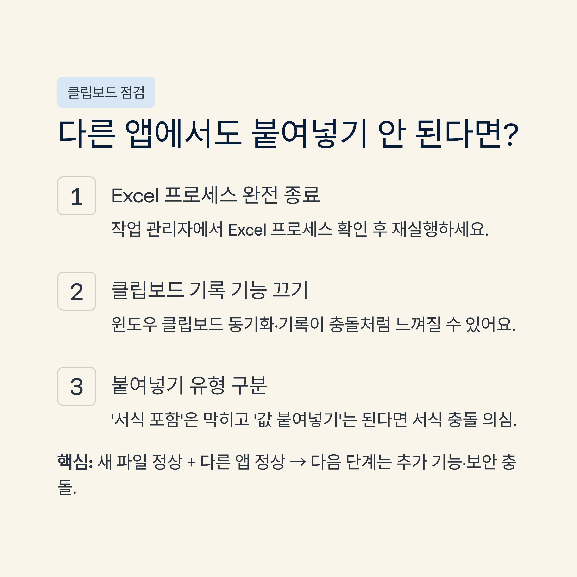 | 다른 앱에서도 붙여넣기가 안 되면요? | 클립보드 충돌 가능성이 커서 Excel 프로세스 종료 후 재실행해요. |