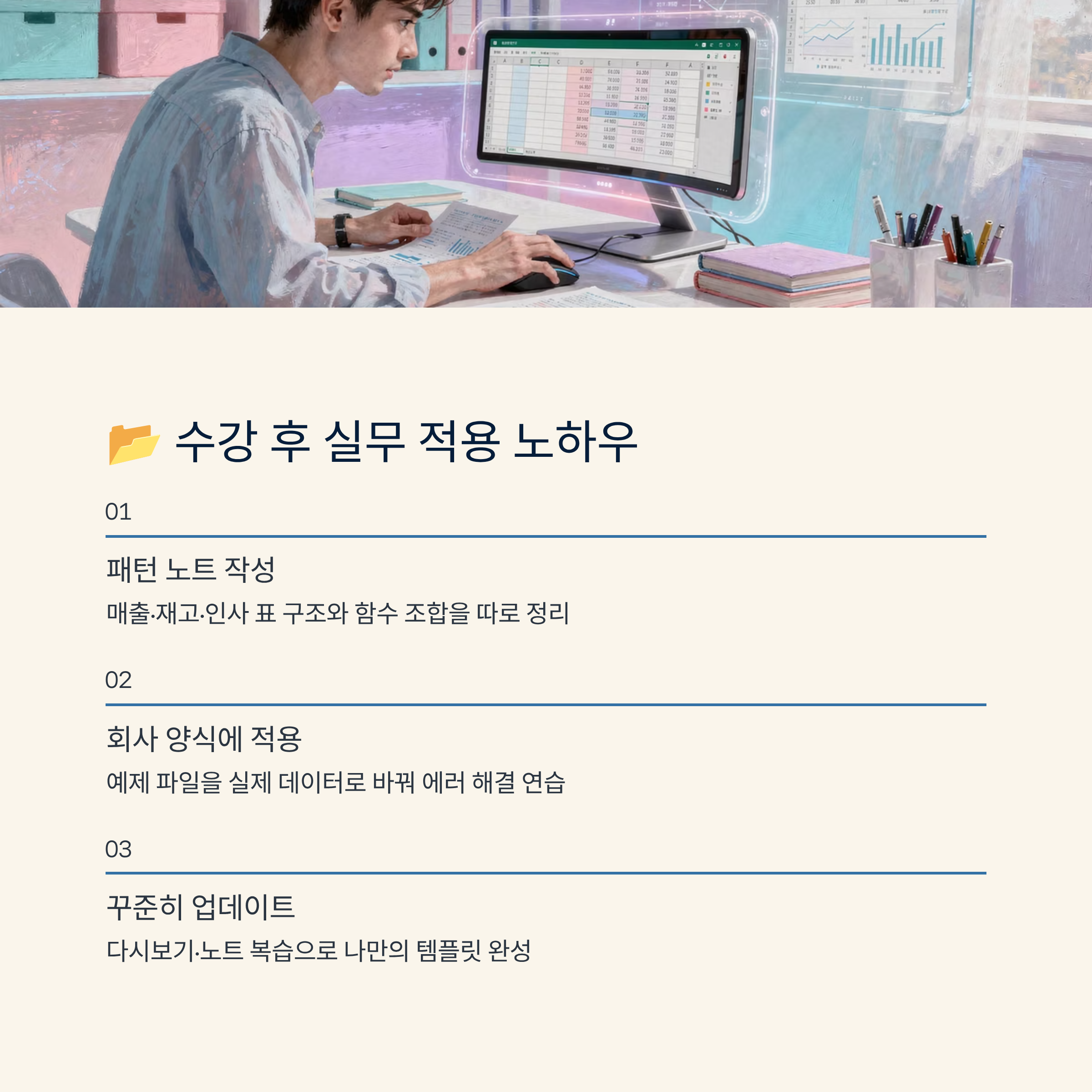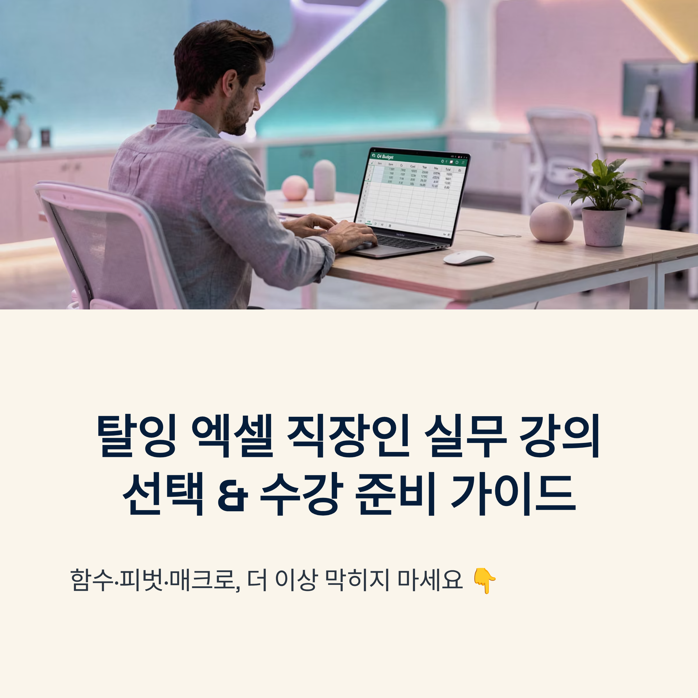 영업·마케팅처럼 데이터를 요약해서 보고해야 하는 직무라면 피벗·차트·대시보드 비중이 높은 수업이 좋고, 회계·총무처럼 반복 입력이 많은 직무라면 함수 조합과 자동화, 양식 설계에 초점이 맞춰진 강의가 더 도움이 돼요.