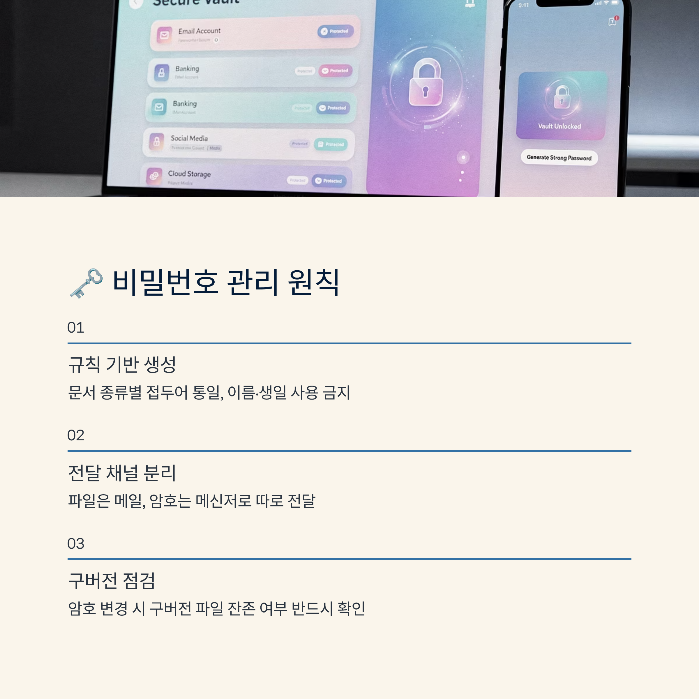 무엇보다 비밀번호를 잊지 않게 관리 규칙까지 같이 세팅해두면 실수로 인한 업무 중단을 크게 줄일 수 있어요.