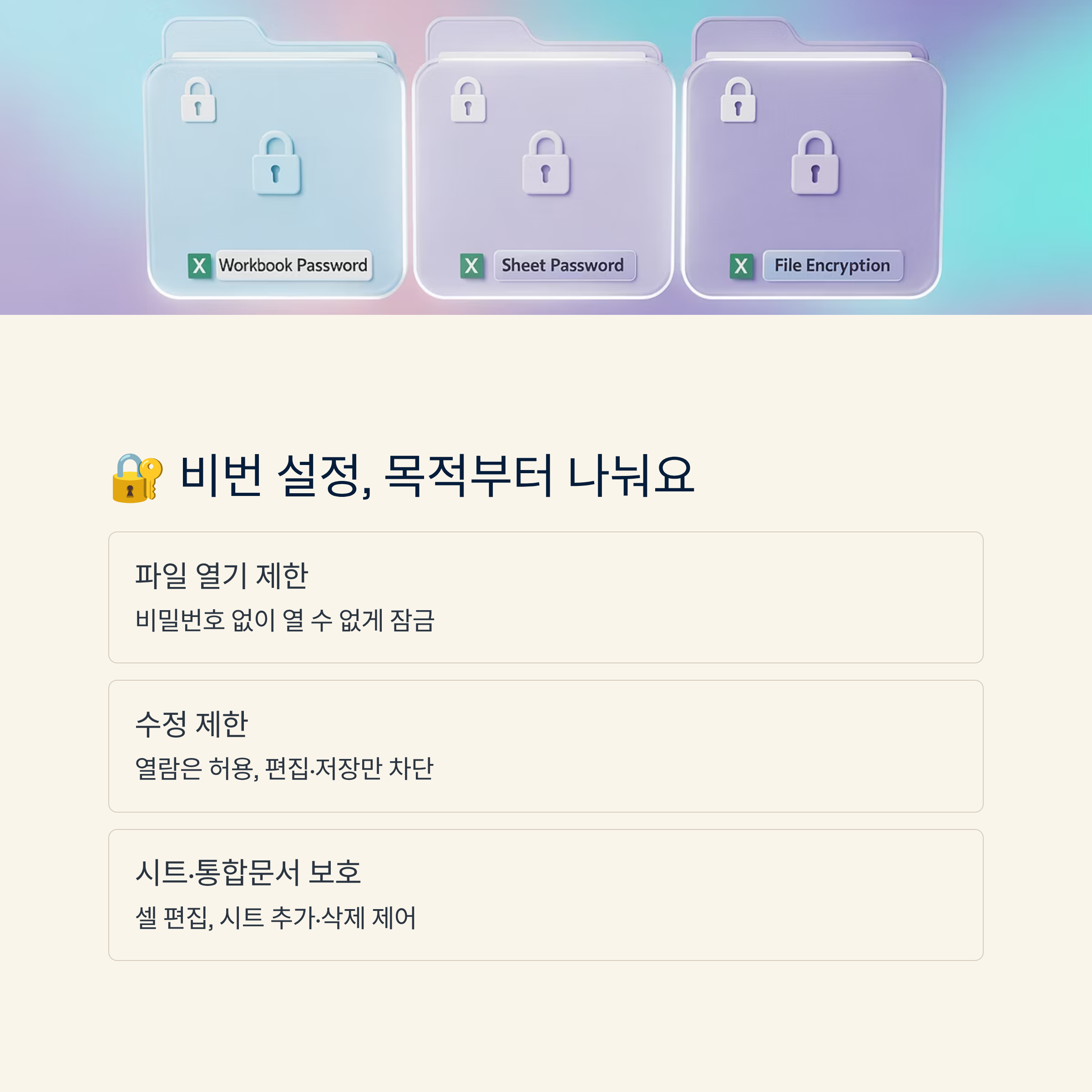 | 핵심 개념 | 파일 열기 암호 / 수정 제한 암호 / 시트·통합문서 보호 |