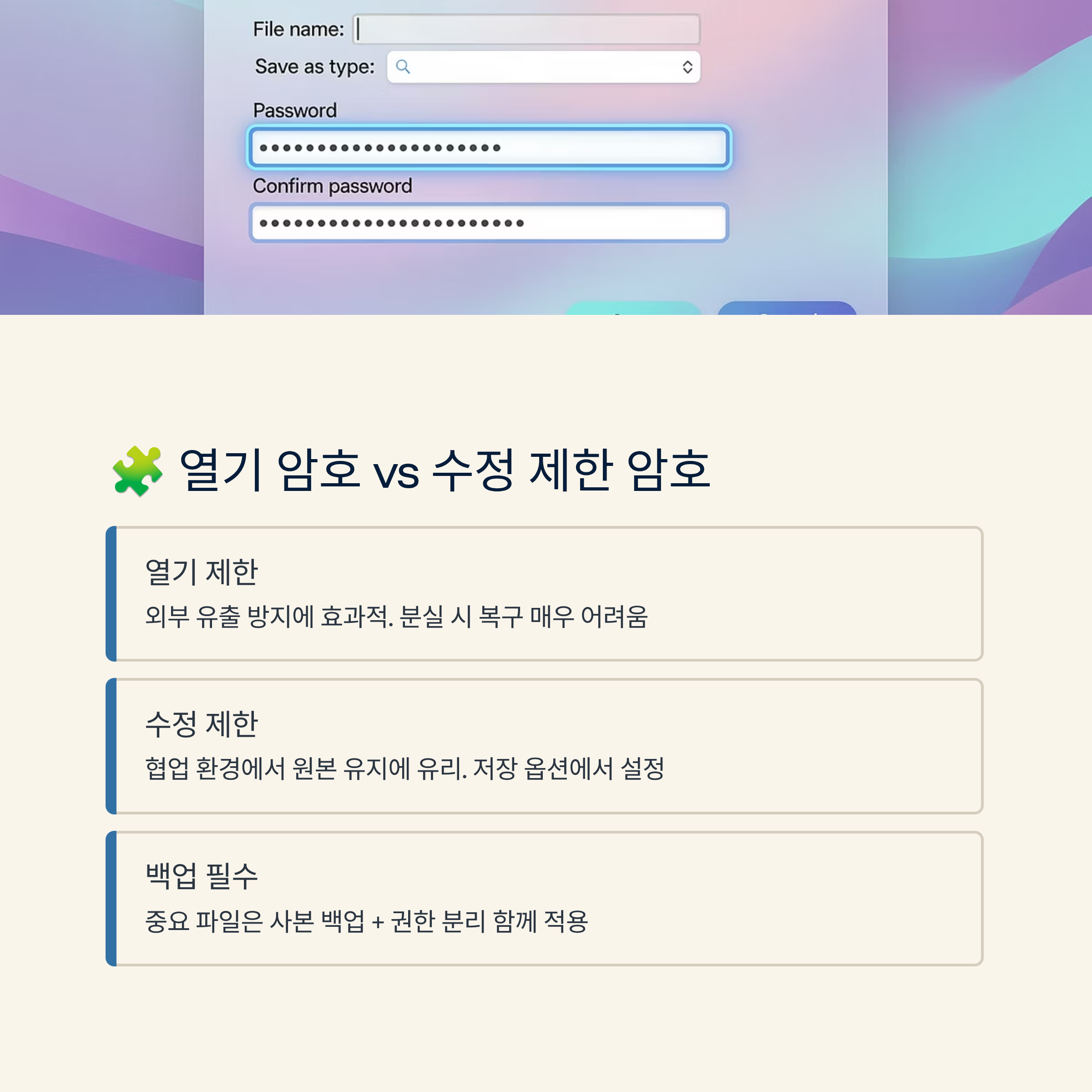 | 열람은 허용하고 수정만 막고 싶을 때는 어떤 설정이 맞나요? | 수정 제한 암호를 사용하고, 원본 파일은 별도로 보관하는 방식이 안정적이에요. |