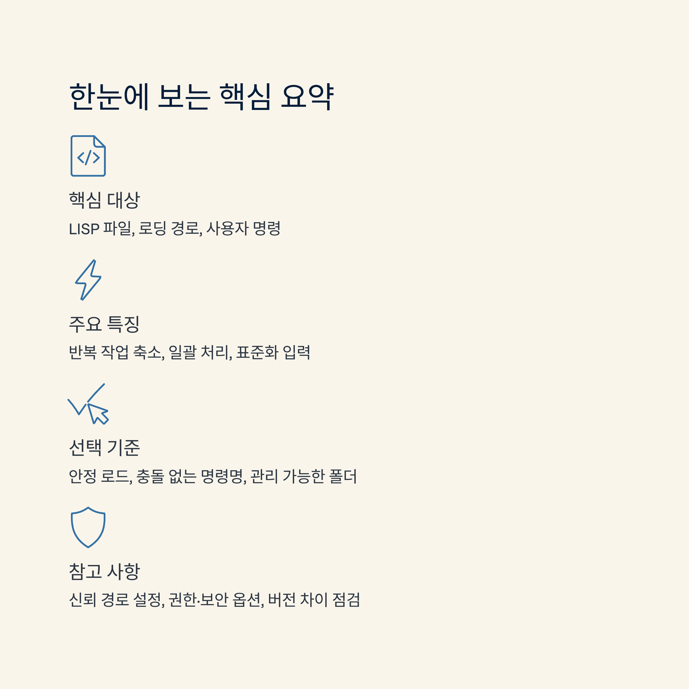 | 핵심 대상 | LISP 스크립트 파일, 로딩 경로, 사용자 명령 |