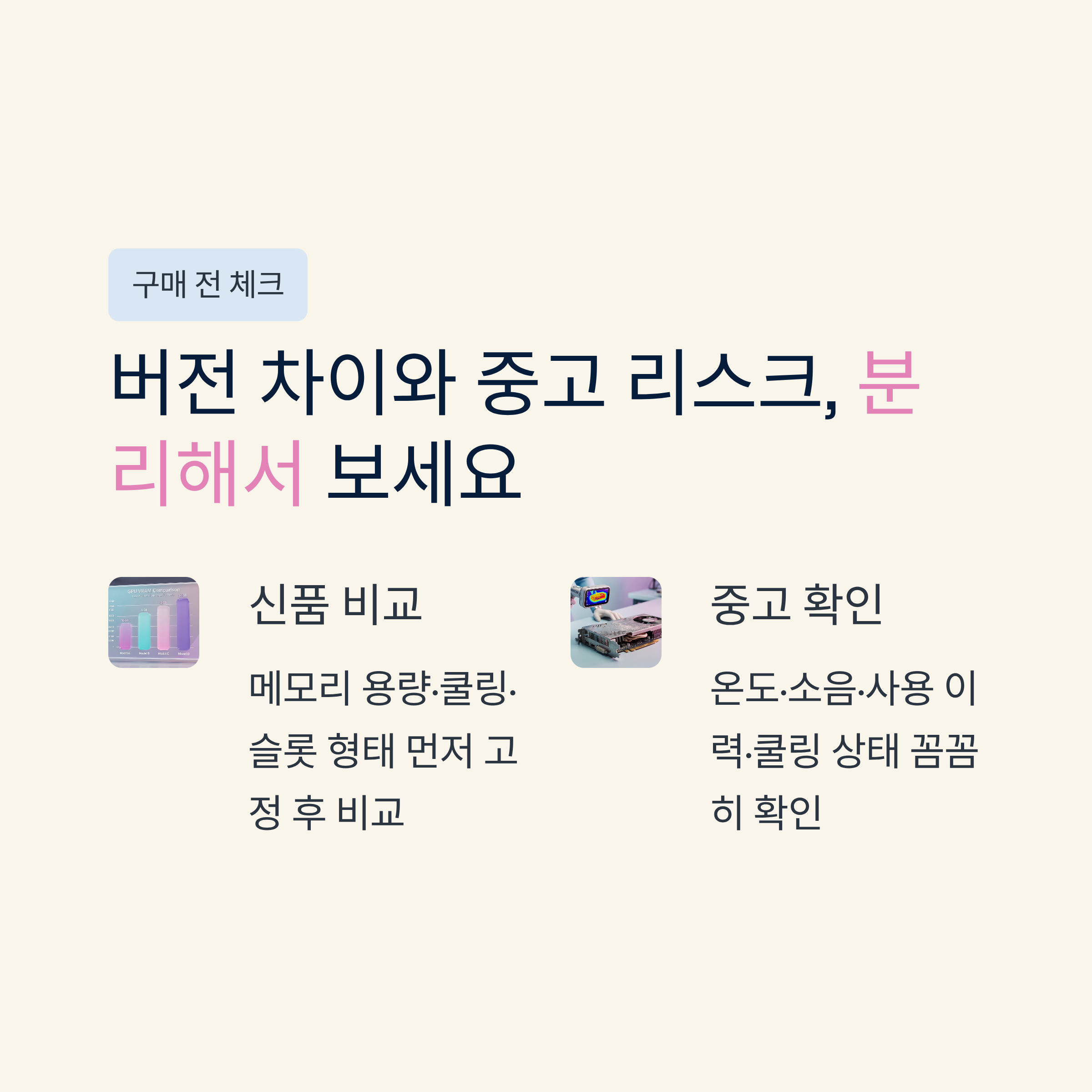VRAM 여유와 장착 조건을 먼저 고정하고, 그 다음에 작업 비중에 맞춰 판단하면 실패 확률이 줄어들어요.