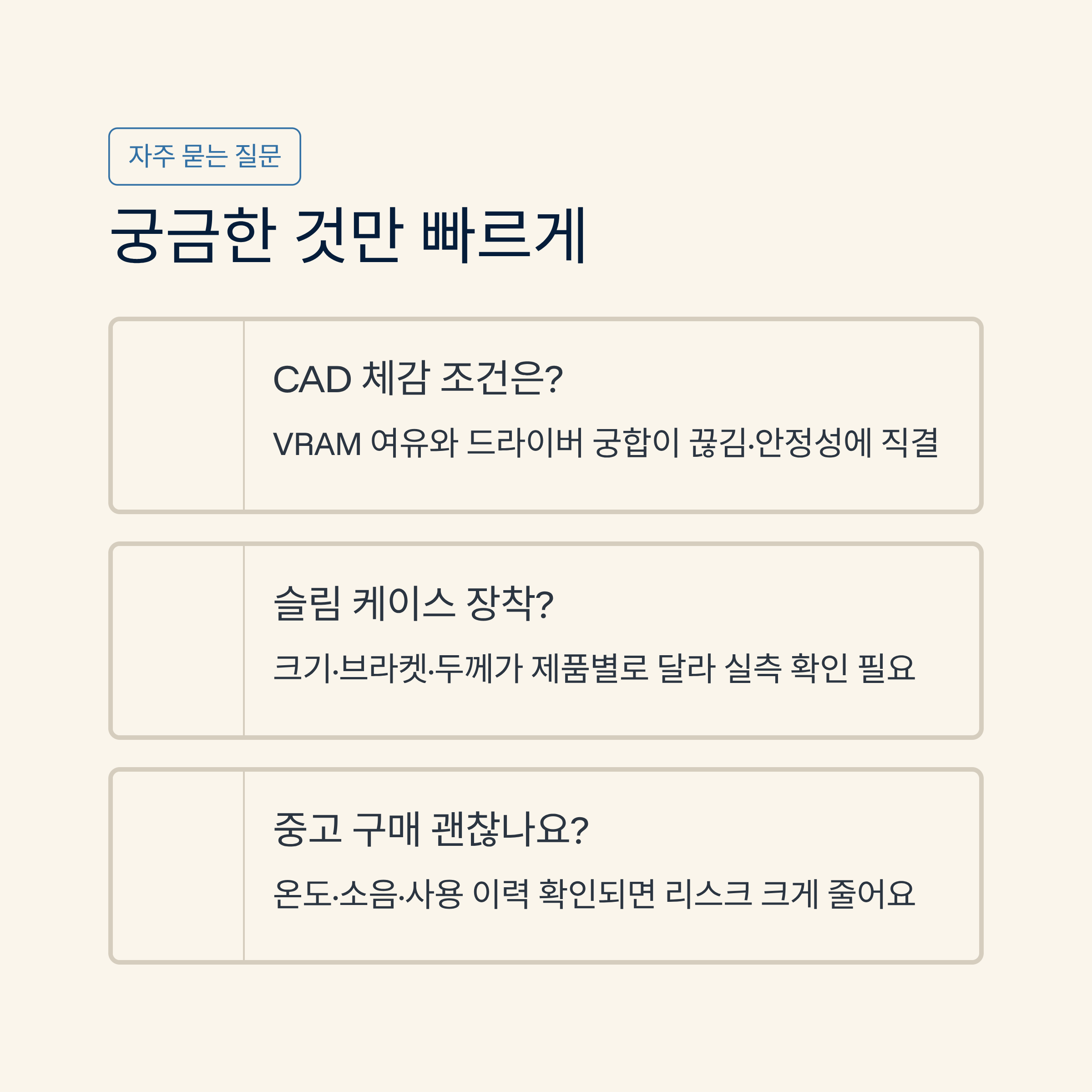 | CAD용으로는 어떤 조건이 가장 먼저 체감되나요? | VRAM 여유와 드라이버 궁합이 끊김과 안정성에 영향을 줘요. |