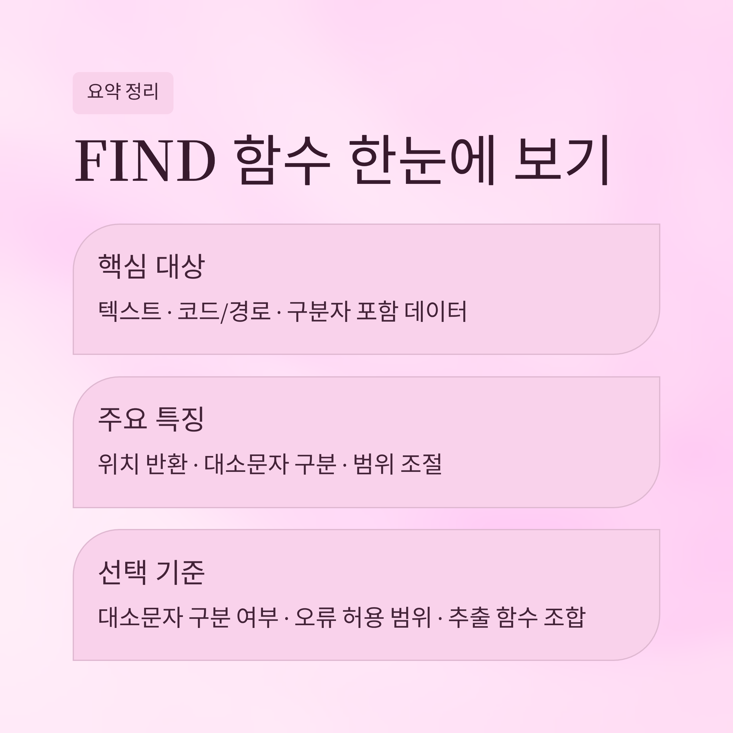 대소문자 구분, 에러 처리, 다른 텍스트 함수와의 조합만 잡아두면 실무 속도가 확 달라져요.